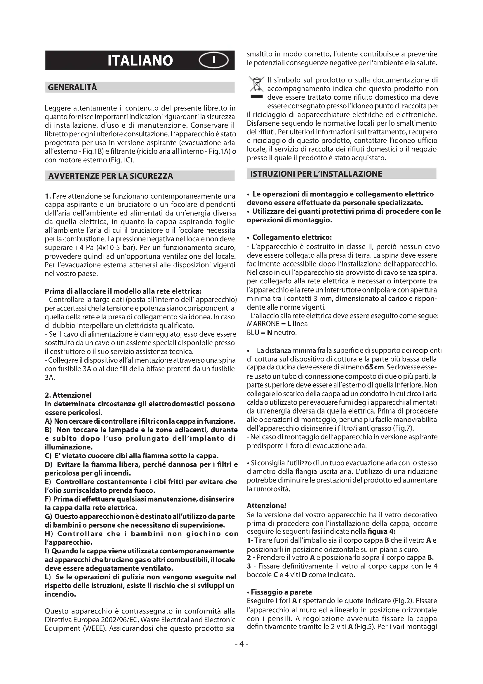 ad apparecchi che bruciano gas o altri combustibili, il locale deve essere adeguatamente ventilato. L) Se le operazioni di pulizia non vengono eseguite nel rispetto delle istruzioni, esiste il rischio che si sviluppi un incendio. Questo apparecchio è contrassegnato in conformità alla Direttiva Europea 2002/96/EC, Waste Electrical and Electronic Equipment (WEEE). Assicurandosi che questo prodotto sia smaltito in modo corretto, l’utente contribuisce a prevenire le potenziali conseguenze negative per l’ambiente e la salute. Il simbolo sul prodotto o sulla documentazione di accompagnamento indica che questo prodotto non deve essere trattato come rifiuto domestico ma deve essere consegnato presso l’idoneo punto di raccolta per il riciclaggio di apparecchiature elettriche ed elettroniche. Disfarsene seguendo le normative locali per lo smaltimento dei rifiuti. Per ulteriori informazioni sul trattamento, recupero e riciclaggio di questo prodotto, contattare l’idoneo ufficio locale, il servizio di raccolta dei rifiuti domestici o il negozio presso il quale il prodotto è stato acquistato.
