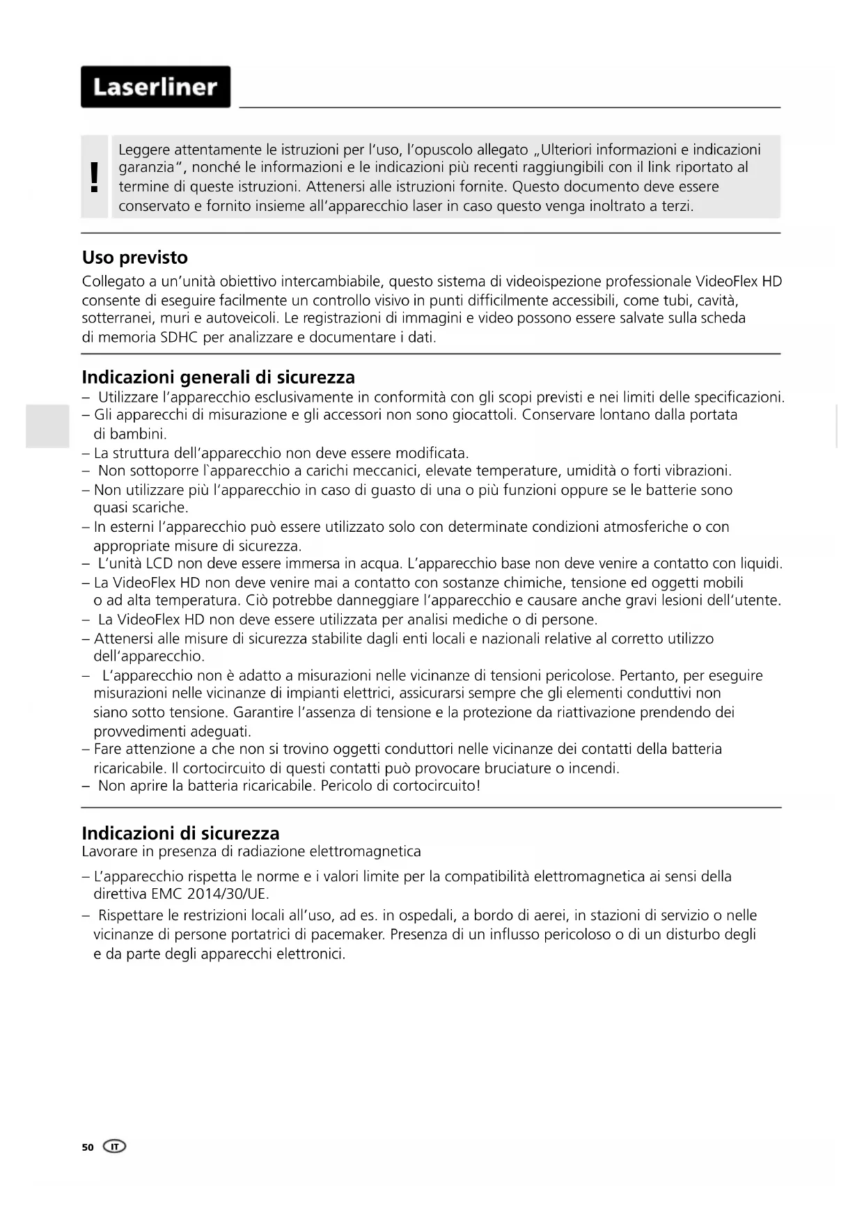 ESLeggere attentamente le istruzioni per l‘uso, l’opuscolo allegato „Ulteriori informazioni e indicazioni garanzia“, nonché le informazioni e le indicazioni più recenti raggiungibili con il link riportato al termine di queste istruzioni. Attenersi alle istruzioni fornite. Questo documento deve essere conservato e fornito insieme all‘apparecchio laser in caso questo venga inoltrato a terzi.