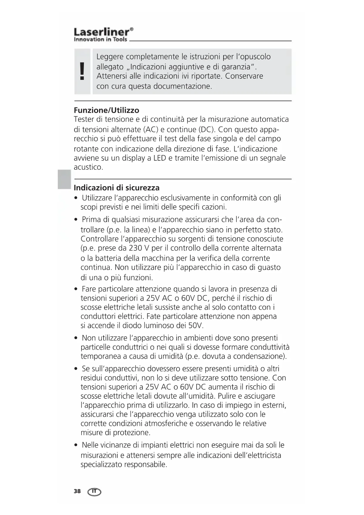Funzione/Utilizzo Tester di tensione e di continuità per la misurazione automatica di tensioni alternate (AC) e continue (DC). Con questo appa- recchio si può effettuare il test della fase singola e del campo rotante con indicazione della direzione di fase. L‘indicazione avviene su un display a LED e tramite l‘emissione di un segnale acustico. Indicazioni di sicurezza