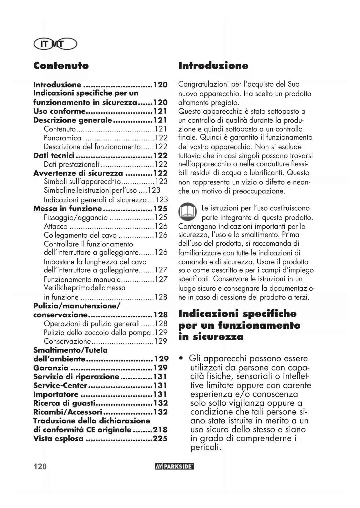 - Gli apparecchi possono essere utilizzati da persone con capa- cità siche, sensoriali o intellet- tive limitate oppure con carente esperienza e/o conoscenza solo sotto vigilanza oppure a condizione che tali persone si- ano state istruite in merito a un uso sicuro dello stesso e siano in grado di comprenderne i pericoli. Contenuto Introduzione ............................120 Indicazioni speciche per un funzionamento in sicurezza ......120 Uso conforme ...........................121 Descrizione generale ................121 Contenuto ...................................121 Panoramica ................................122 Descrizione del funzionamento......122 Dati tecnici ...............................122 Dati prestazionali ........................122 Avvertenze di sicurezza ...........122 Simboli sull’apparecchio ...............123 Simboli nelle istruzioni per l’uso ....123 Indicazioni generali di sicurezza ... 123 Messa in funzione ....................125 Fissaggio/aggancio ....................125 Attacco ......................................126 Collegamento del cavo ................126 Controllare il funzionamento dell’interruttore a galleggiante.......126 Impostare la lunghezza del cavo dell’interruttore a galleggiante.......127 Funzionamento manuale ...............127 Veriche prima della messa in funzione .................................128 Pulizia/manutenzione/ conservazione .......................... 128 Operazioni di pulizia generali ......128 Pulizia dello zoccolo della pompa .129 Conservazione ............................129 Smaltimento/Tutela dell’ambiente ........................... 129 Garanzia .................................129 Servizio di riparazione .............131 Service-Center ..........................131 Importatore .............................131 Ricerca di guasti ....................... 132 Ricambi/Accessori ....................132 Traduzione della dichiarazione di conformità CE originale ........218 Vista esplosa ...........................225121 IT MT