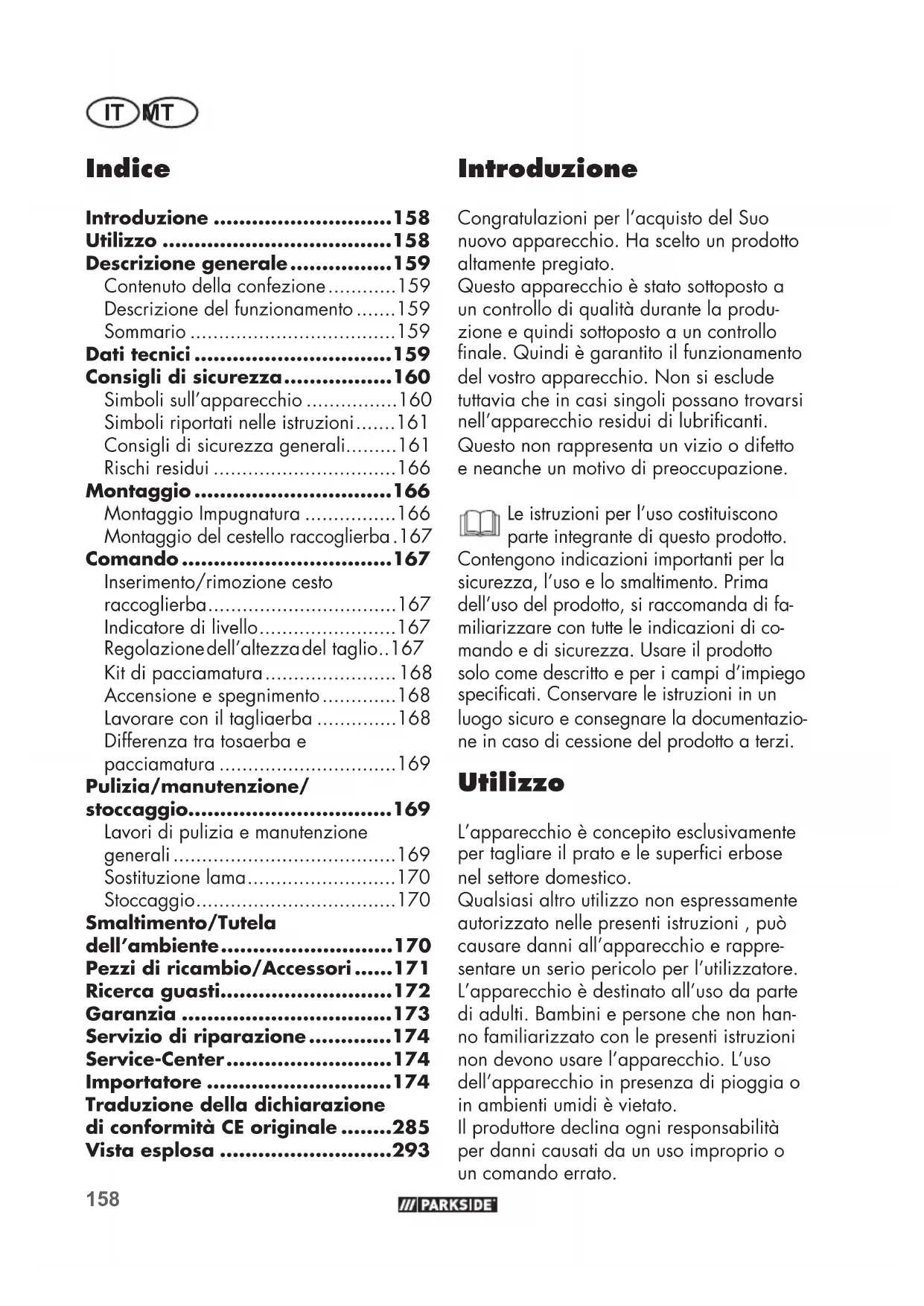 - Importatore Introduzione Congratulazioni per l’acquisto del Suo nuovo apparecchio. Ha scelto un prodotto altamente pregiato. Questo apparecchio è stato sottoposto a un controllo di qualità durante la produ- zione e quindi sottoposto a un controllo nale. Quindi è garantito il funzionamento del vostro apparecchio. Non si esclude tuttavia che in casi singoli possano trovarsi nell’apparecchio residui di lubricanti. Questo non rappresenta un vizio o difetto e neanche un motivo di preoccupazione. Le istruzioni per l’uso costituiscono parte integrante di questo prodotto. Contengono indicazioni importanti per la sicurezza, l’uso e lo smaltimento. Prima dell’uso del prodotto, si raccomanda di fa- miliarizzare con tutte le indicazioni di co- mando e di sicurezza. Usare il prodotto solo come descritto e per i campi d’impiego specicati. Conservare le istruzioni in un luogo sicuro e consegnare la documentazio- ne in caso di cessione del prodotto a terzi. Utilizzo L’apparecchio è concepito esclusivamente per tagliare il prato e le superci erbose nel settore domestico. Qualsiasi altro utilizzo non espressamente autorizzato nelle presenti istruzioni , può causare danni all’apparecchio e rappre- sentare un serio pericolo per l’utilizzatore. L’apparecchio è destinato all’uso da parte di adulti. Bambini e persone che non han- no familiarizzato con le presenti istruzioni non devono usare l’apparecchio. L’uso dell’apparecchio in presenza di pioggia o in ambienti umidi è vietato. Il produttore declina ogni responsabilità per danni causati da un uso improprio o un comando errato.159 IT MT 8 Vite a galletto e rondella per il ssaggio della sbarra 9 Cavo dell’apparecchio 10 Cestello raccoglierba 11 L’indicatore di livello 12 Serracavi 13 Dado a galletto, vite e rondella per il ssaggio della sbarra 14 Presa per prolunga 15 Pulsante di sblocco 16 Leva di avvio 17 Kit di pacciamatura 18 Cavo di prolunga (non in dotazione) p. 174
