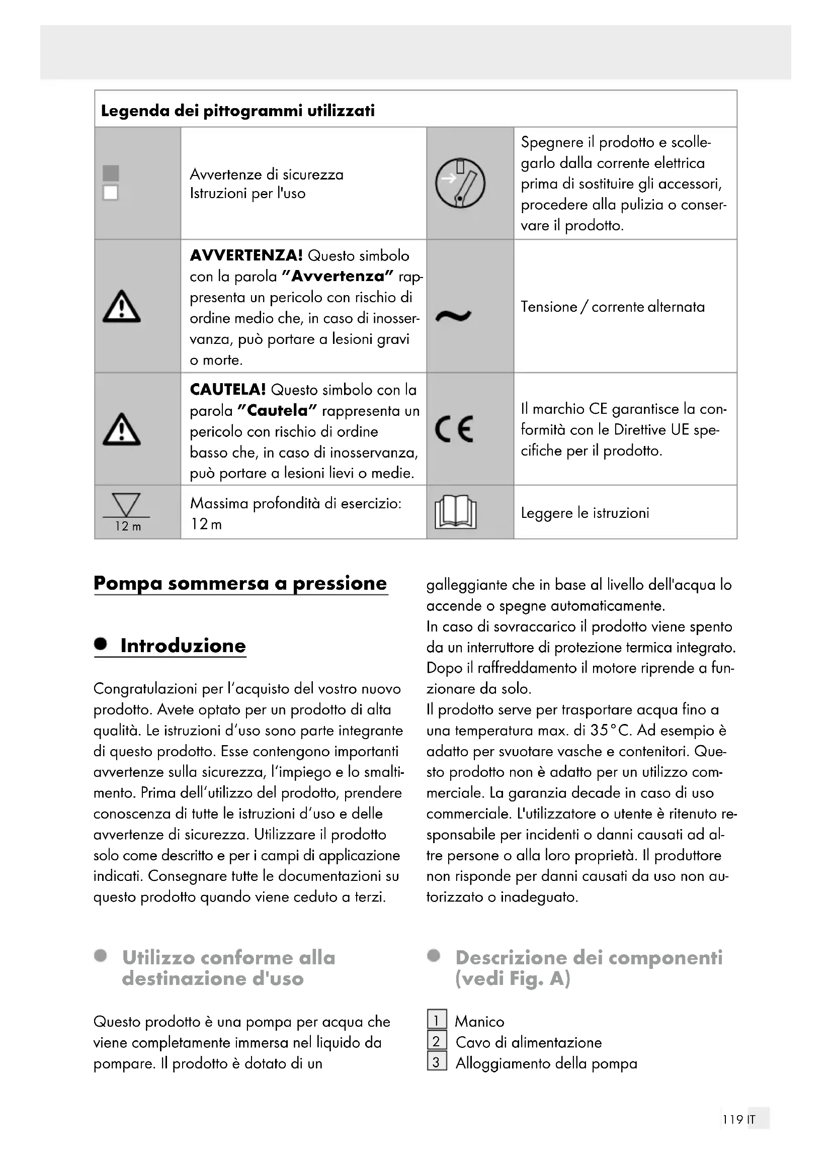 , 50 Hz Potenza assorbita (P): 1000 W Max. quantità trasportata (Qmax): ca. 6500 l/h Max. altezza di trasporto (Hmax): 40 m Max. profondità di immersione: 12 m Max. temperatura dell'acqua (Tmax): 35 °C Collegamento del tubo flessibile: ¾", 1" (19 mm, 25 mm) Collegamento per raccordo con filettatura interna: G ¾" (19 mm) Max. granulosità (materiali in sospensione aspirabili): Ø 1 mm Lunghezza del cavo di alimentazione: 15 m Peso (incl. accessori): 10,2 kg Classe di isolamento: I Tipo di isolamento: IPX 8 Avvertenze di sicurezza