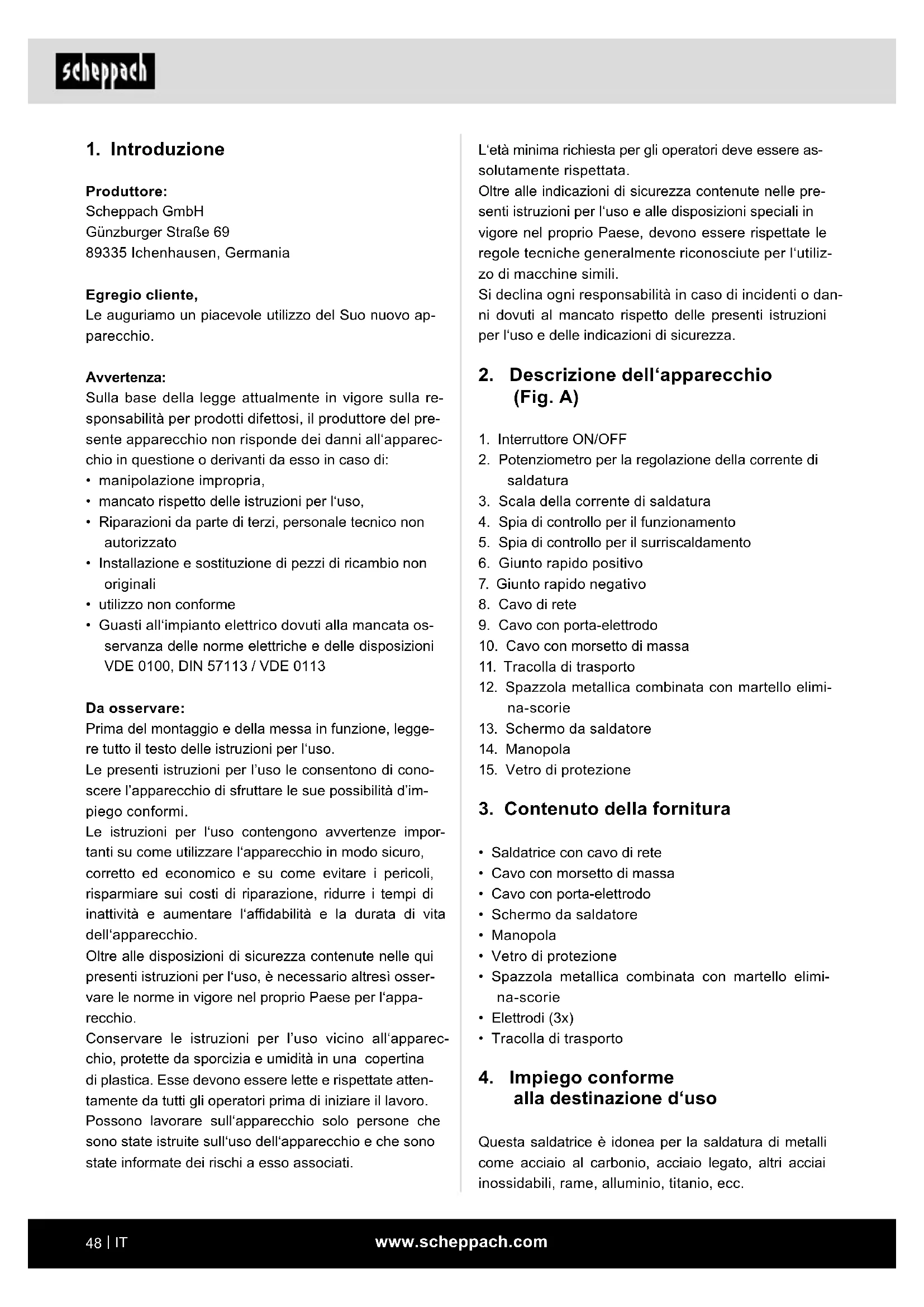 Da osservare: Prima del montaggio e della messa in funzione, legge- re tutto il testo delle istruzioni per l‘uso. Le presenti istruzioni per l’uso le consentono di cono- scere l’apparecchio di sfruttare le sue possibilità d’im- piego conformi. Le istruzioni per l‘uso contengono avvertenze impor- tanti su come utilizzare l‘apparecchio in modo sicuro, corretto ed economico e su come evitare i pericoli, risparmiare sui costi di riparazione, ridurre i tempi di inattività e aumentare l‘adabilità e la durata di vita dell‘apparecchio. Oltre alle disposizioni di sicurezza contenute nelle qui presenti istruzioni per l‘uso, è necessario altresì osser- vare le norme in vigore nel proprio Paese per l‘appa- recchio. Conservare le istruzioni per l’uso vicino all‘apparec- chio, protette da sporcizia e umidità in una copertina di plastica. Esse devono essere lette e rispettate atten- tamente da tutti gli operatori prima di iniziare il lavoro. Possono lavorare sull‘apparecchio solo persone che sono state istruite sull‘uso dell‘apparecchio e che sono state informate dei rischi a esso associati.www.scheppach.com