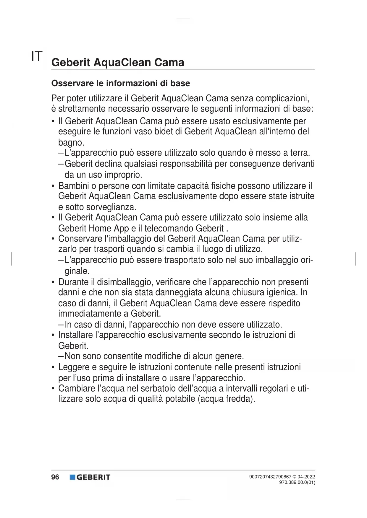 9007207432790667 © 04-2022970.389.00.0(01) Geberit AquaClean Cama Osservare le informazioni di base Per poter utilizzare il Geberit AquaClean Cama senza complicazioni, è strettamente necessario osservare le seguenti informazioni di base: