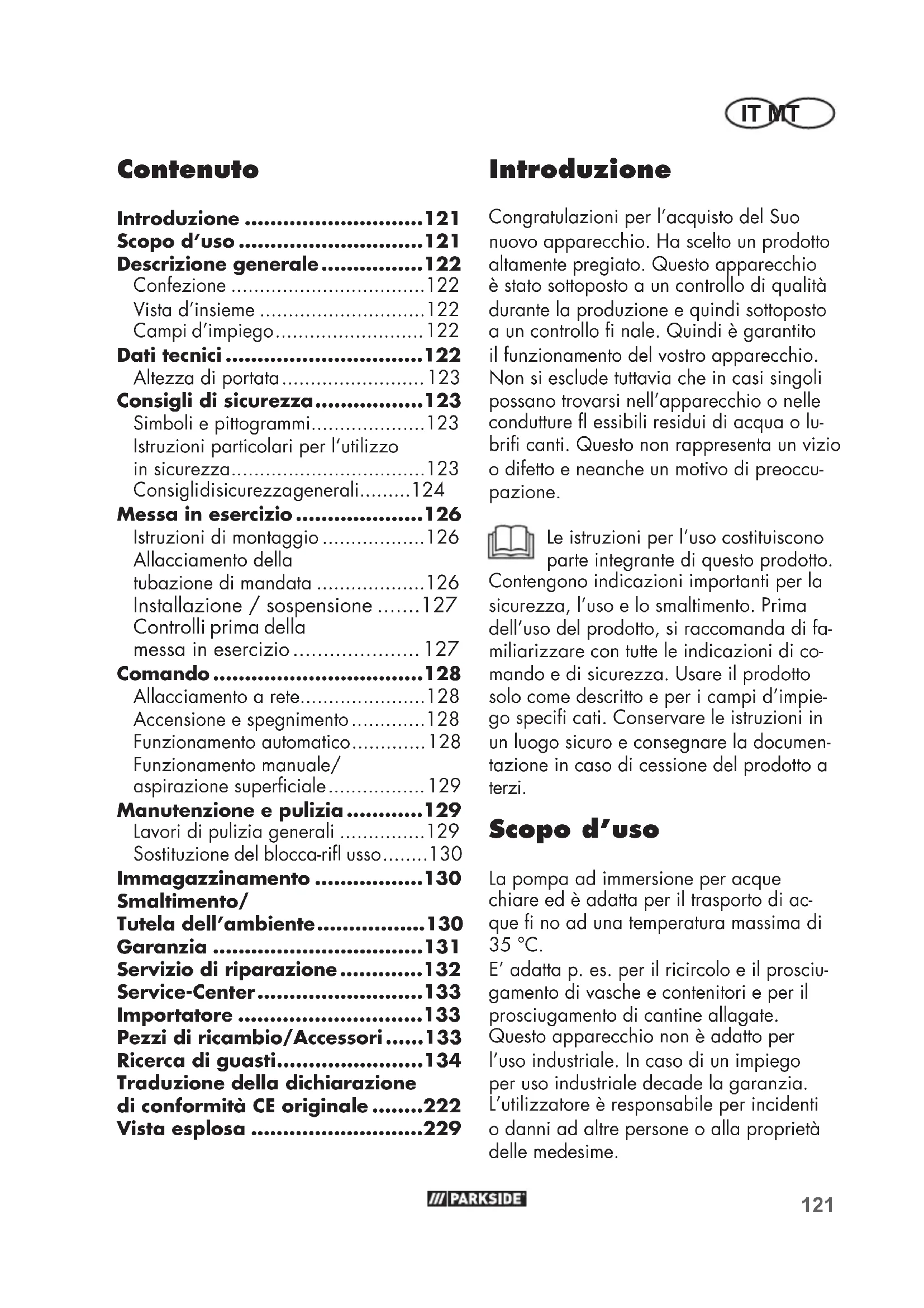 Smaltimento/Tutela dell’ambiente Effettuare lo smaltimento dell’apparecchio, degli accessori e della confezione nel rispetto dell’ambiente presso un punto di raccolta per riciclaggio. Le apparecchiature non devono essere smaltite insieme ai rifi uti do- mestici. Consegnare l’apparecchiatura presso un centro di raccolta e recupero. Le parti pla- stiche e di metallo usate potranno essere selezionate e avviate al recupero. Chiede- re informazioni a riguardo al nostro centro assistenza clienti. Lo smaltimento degli apparecchio difettosi consegnati viene effettuato gratuitamente.131 IT MT Garanzia Gentile cliente, Su questo apparecchio Le viene concessa una garanzia di 3 anni a partire dalla data di acquisto. In caso di difetti di questo prodotto può avanzare diritti legali nei confronti del ven- ditore del prodotto. Tali diritti legali non vengono limitati dalla nostra garanzia qui di seguito rappresentata. Condizioni di garanzia Il termine di garanzia inizia con la data di acquisto. La preghiamo di conservare in un luogo sicuro lo scontrino fi scale origina- le. Questo documento viene richiesto come prova d’acquisto. Qualora subentrasse un difetto di mate- riale o di fabbricazione entro tre anni a partire dalla data di acquisto di questo prodotto, il prodotto verrà riparato o sosti- tuito – a nostra discrezione - gratuitamente da noi. Questa prestazione di garanzia presuppone che venga presentato entro il termine di tre anni l’apparecchio difettoso e la prova d’acquisto (scontrino fi scale) e descritto brevemente per iscritto in che cosa consiste il difetto e quando si è veri- fi c a t o . Se il difetto è coperto dalla nostra garan- zia, riceverà il prodotto riparato oppure un prodotto nuovo. Con la riparazione o la sostituzione del prodotto non inizia un nuovo periodo di garanzia. Tempo di garanzia e diritti legali per vizi della cosa Il periodo di garanzia non viene prolunga- to. Questo vale anche per parti sostituite e riparate. Difetti e vizi presenti già al momento dell’acquisto devono essere segnalati immediatamente dopo la rimo- zione dall’imballaggio. Riparazioni che accorrono dopo il periodo di garanzia sono a pagamento. Volume di garanzia L’apparecchio è stato prodotto accurata- mente secondo severe direttive di qualità e controllato con coscienza prima della consegna. La prestazione di garanzia vale per difetti di materiale o di fabbricazione. Questa garanzia non si estende ai componenti del prodotto che sono soggetti a normale usu- ra e che quindi possono essere visti come parti di usura (p. es. blocca-rifl usso, anello di tenuta) oppure per danneggiamenti del- le parti fragili (p. es. interruttori). Questa garanzia decade se il prodotto è stato danneggiato, non usato correttamen- te o non manutenuto. Per un uso corretto del prodotto devono essere osservate tutte le indicazioni riportate nelle istruzioni per l’uso. Destinazioni d’uso e azioni sconsi- gliate nelle istruzioni d’uso o dalle quali si viene avvertiti, sono tassativamente da evitare. Il prodotto è destinato solo per i privati e non per uso commerciale. In caso di uso improprio, esercizio della forza e inter- venti non effettuati dalla nostra fi liale di assistenza tecnica autorizzata, decade la garanzia. Esclusi dalla garanzia sono danni dovuti a trasporti di liquidi aggressivi o altri usi impropri, poiché in tali casi vengono dan- neggiati guarnizioni, ruota a pale, motore o altri componenti della pompa. Anche le pompe per acque non sono adatte per il trasporto di materiali abrasivi (sabbia, pietre).132 IT MT Attenzione: le pompe ad immersione sono delle pompe di drenaggio. La costruzione di una pompa ad immersione persegue lo scopo di trasportare o drenare, nell‘ambito della sua classe di rendimento, nel minore tempo possibile un dato volume d‘acqua. Le pompe ad immersione non sono adatte per l‘uso come pompe da irrigazione (per esempio per l‘irrigazione del giardino) o come pompa a ciclo continuo (per esem- pio per ruscelli o per fontane di laghetti). In caso di utilizzo per uno scopo diverso da quello previsto decade ogni diritto di garanzia. Controllare a intervalli regolari il funziona- mento dell’interruttore a galleggiante. La mancata osservanza o il funzionamento a secco della pompa annullano i diritti di garanzia e responsabilità. Il diritto di garanzia cessa in particolare con impiego delle pompe senza piastra di base oppure (e ciò vale per tutte le pompe) nel caso di danni causati dal fatto che la pompa è stata appesa o sostenuta con il cavo di rete. Le pompe non devono essere in funzione a secco oppure essere esposte al gelo. Svolgimento in caso di garanzia Per garantire una rapida elaborazione del- la Sua pratica, La preghiamo di seguire le seguenti indicazioni: