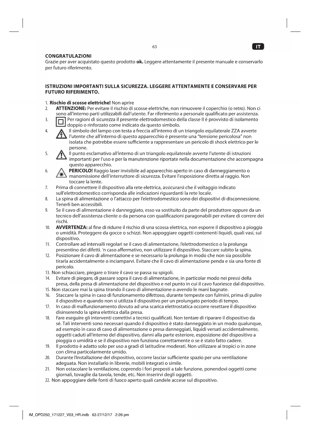 Potenza in entrata 100 - 240 V~, 50/60 Hz Potenza assorbita < 8 W CONNESSIONI Ingresso USB 1 Uscita R/L 1 SCART 1 Video 1 HDMI 1 SMALTIMENTO Non smaltire questi apparecchi con i riuti domestici. Consegnarlo presso un punto di raccolta per il riciclo WEEE. Così aiutate a risparmiare le risorse ed a proteggere l’ambiente. Contattare le autorità o il rivenditore locale per ulteriori informazioni. Smaltire le batterie rispettando l’ambiente. Non mettere le batterie nei riuti domestici. Usare i sistemi di raccolta e restituzione locali o contattare il rivenditore presso il quale è stato acquistato il prodotto. IM_OPD250_171227_V03_HR.indb 72 27/12/17 2:26 pm73