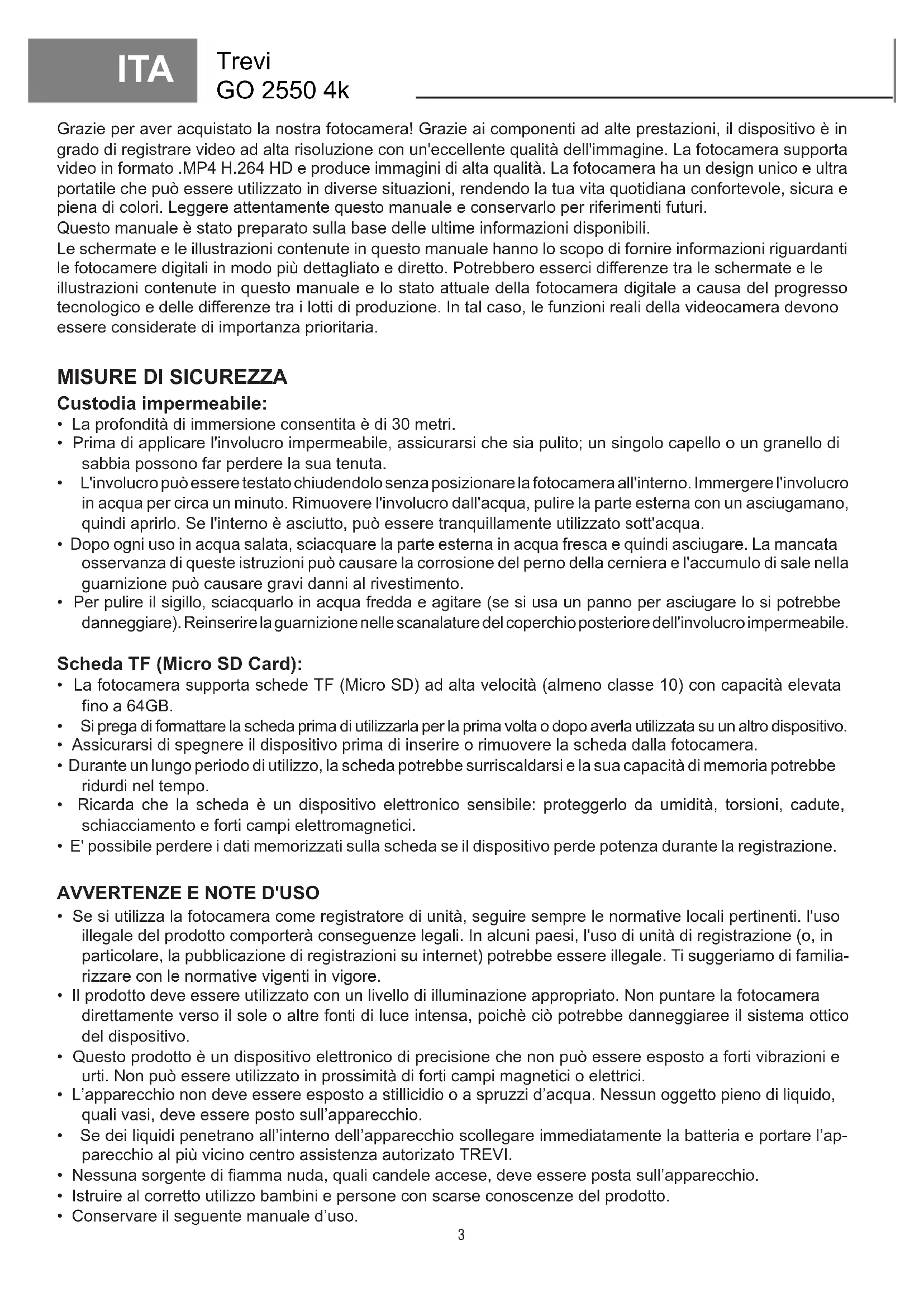ITA10 Trevi GO 2550 4K ITA SPECIFICHE TECNICHE Display: ...................................... 2.0" + 1.3" IPS Lente: ...................................... 145° Wide angle lens Risoluzione registrazioni Video: ................................ 30FPS 4K - 30FPS 2.7K 60FPS 1080p - 30FPS 1080p 120FPS 720p - 60FPS 720p - 30FPS 720p Formato Video: ...................................... MP4 Risoluzione Foto: ...................................... 16M/12M/8M/5M/2M Memoria massima supportata: .................................. Micro SDHC classe 10 64GB Frequenza Wi-Fi: ...................................... 2,4GHz Potenza Wi-Fi: ...................................... 1,5mW Compatibilità Wi-Fi: ...................................... iOS 7 superiori, Android 4.1 superiori Funzione Wi-Fi: ...................................... Trasmissione di immagini, controllo remoto, impostazione, sincronizz. e condivisione di album Frequenza: ...................................... Auto/ 50Hz/ 60Hz Connessioni: ...................................... USB 2.0 Alimentazione: ...................................... 5V, 1A Capacità batteria: ...................................... 3,7V, 900mAh Durata della batteria: ...................................... In 1080p circa 90 minuti Tempo di ricarica: ...................................... circa 3 ore Compatibilità sistemi operativi: .................................. Windows XP/Vista/Win7 e superiori Mac 10.5 superiori Dimensioni: ...................................... 61x 44x 31,5mm Peso: ...................................... 61 gr con batteria INFORMAZIONI AGLI UTENTI ai sensi del Decreto Legislativo N°49 del 14 Marzo 2014 “Attuazione della Direttiva 2012/19/UE sui riuti di apparecchiature elettriche ed elettroniche (RAEE)” Il simbolo del cassonetto barrato riportato sull’apparecchiatura indica che il prodotto alla ne della propria vita utile deve essere raccolto separatamente dagli altri riuti. L’utente dovrà, pertanto, conferire l’apparecchiatura integra dei componenti essenziali giunta a ne vita agli idonei centri di raccolta dierenziata dei riuti elettronici ed elettrotecnici, oppure riconsegnarla al rivenditore al momento dell’acquisto di nuova apparecchiatura di tipo equivalente, in ragione di uno a uno, oppure 1 a zero per le apparecchiature aventi lato maggiore inferiore a 25cm. L’adeguata raccolta dierenziata per l’avvio successivo dell’apparecchiatura dimessa al riciclaggio, al trat- tamento e allo smaltimento ambientale compatibile contribuisce ad evitare possibili eetti negativi sull’ambiente e sulla salute e favorisce il riciclo dei materiali di cui è composta l’apparecchiatura. Lo smaltimento abusivo del prodotto da parte dell’utente comporta l’applicazione delle sanzioni amministrative di cui al D.Lgs n. Decreto Legislativo N°49 del 14 Marzo 2014.11 Trevi GO 2550 4k ENG Thank you for purchasing this Wi-Fi camera. Thanks to the high-performance components, the device is capable of recording videos with excellent image quality. The camera has a unique and ultra-portable design that can be used in dierent situations, making your daily life comfortable, safe and full of color. Read this manual carefully and keep it for future reference. The screenshots and illustrations in this manual are intended to provide you with more detailed and straightforward information about your digital camera. There may be dierences between the screenshots, illustrations contained in this manual and the current state of the digital camera, due to technological improvements and dierences between production batches. In such a case, the actual functions of the camera should be considered as a priority. SAFETY MEASURES Waterproof casing: