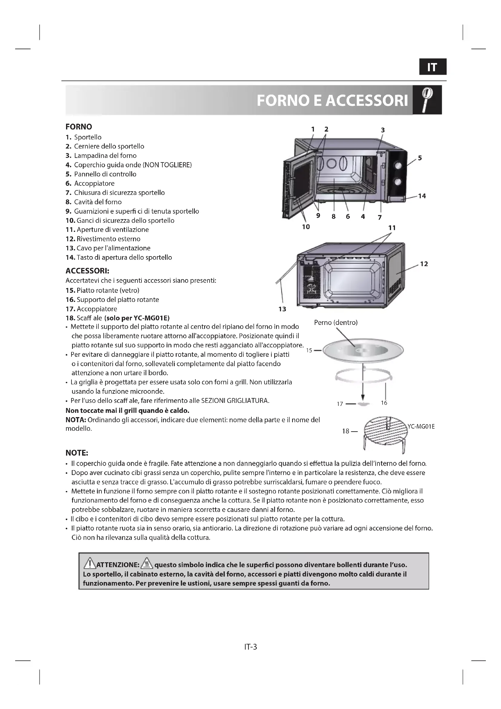 FORNO 1. Sportello2. Cerniere dello sportello3. Lampadina del forno4. Coperchio guida onde (NON TOGLIERE)5. Pannello di controllo6. Accoppiatore7. Chiusura di sicurezza sportello8. Cavità del forno9. Guarnizioni e super ci di tenuta sportello10. Ganci di sicurezza dello sportello11. Aperture di ventilazione12. Rivestimento esterno13. Cavo per l'alimentazione14. Tasto di apertura dello sportello ACCESSORI: Accertatevi che i seguenti accessori siano presenti:15. Piatto rotante (vetro)16. Supporto del piatto rotante17. Accoppiatore18. Sca ale (solo per YC-MG01E)• Mettete il supporto del piatto rotante al centro del ripiano del forno in modo che possa liberamente ruotare attorno all'accoppiatore. Posizionate quindi il piatto rotante sul suo supporto in modo che resti agganciato all'accoppiatore.• Per evitare di danneggiare il piatto rotante, al momento di togliere i piatti o i contenitori dal forno, sollevateli completamente dal piatto facendo attenzione a non urtare il bordo. • La griglia è progettata per essere usata solo con forni a grill. Non utilizzarla usando la funzione microonde.• Per l’uso dello sca ale, fare riferimento alle SEZIONI GRIGLIATURA.Non toccate mai il grill quando è caldo.NOTA: Ordinando gli accessori, indicare due elementi: nome della parte e il nome del modello. NOTE: