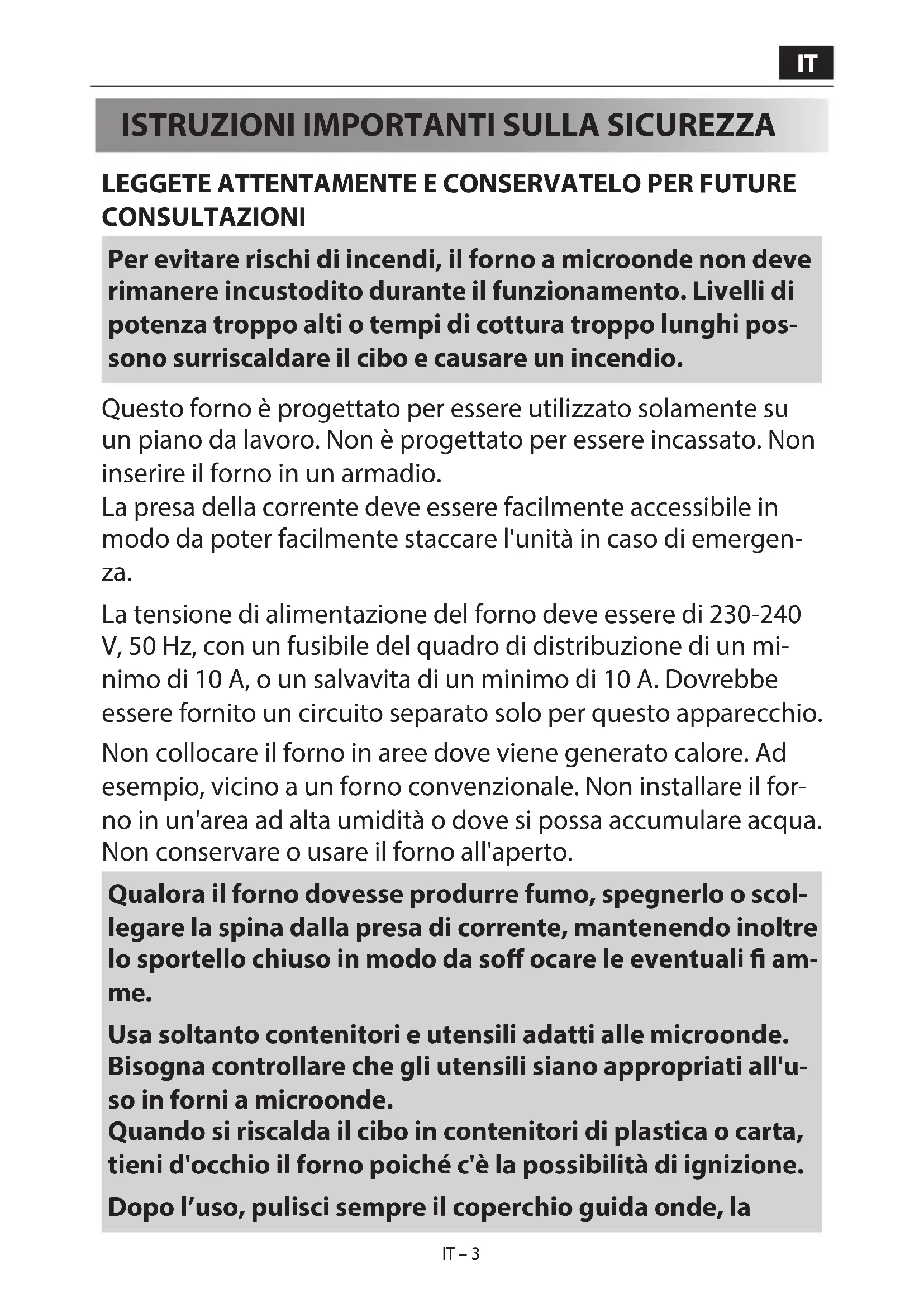 CONSULTAZIONI Per evitare rischi di incendi, il forno a microonde non deve rimanere incustodito durante il funzionamento. Livelli di potenza troppo alti o tempi di cottura troppo lunghi pos- sono surriscaldare il cibo e causare un incendio. Questo forno è progettato per essere utilizzato solamente su un piano da lavoro. Non è progettato per essere incassato. Non inserire il forno in un armadio. La presa della corrente deve essere facilmente accessibile in modo da poter facilmente staccare l'unità in caso di emergen- za. La tensione di alimentazione del forno deve essere di 230-240 V, 50Hz, con un fusibile del quadro di distribuzione di un mi- nimo di 10A, o un salvavita di un minimo di 10 A. Dovrebbe essere fornito un circuito separato solo per questo apparecchio. Non collocare il forno in aree dove viene generato calore. Ad esempio, vicino a un forno convenzionale. Non installare il for- no in un'area ad alta umidità o dove si possa accumulare acqua. Non conservare o usare il forno all'aperto. Qualora il forno dovesse produrre fumo, spegnerlo o scol- legare la spina dalla presa di corrente, mantenendo inoltre lo sportello chiuso in modo da soff ocare le eventuali am- me. Usa soltanto contenitori e utensili adatti alle microonde. Bisogna controllare che gli utensili siano appropriati all'u- so in forni a microonde. Quando si riscalda il cibo in contenitori di plastica o carta, tieni d'occhio il forno poiché c'è la possibilità di ignizione. Dopo l’uso, pulisci sempre il coperchio guida onde, laIT – 4 IT – 4 cavità del forno, il piatto rotante: devono essere asciutti e senza tracce di grasso. Gli accumuli di grasso possono surriscaldarsi, fumare o in ammarsi. Non mettere materiali in ammabili vicino al forno o alle aper- ture di ventilazione. Non ostruire le aperture di ventilazione. Rimuovi tutti i sigilli di metallo, chiusure in l di ferro ecc. dal cibo e della confezioni. Gli archi elettrici sulle super ci metalli- che potrebbero causare un incendio. Non usare il forno a microonde per scaldare l'olio per la frittura. La temperatura non può essere controllata e l'olio potrebbe in ammarsi. Per preparare i popcorn, usa soltanto prodotti per la prepara- zione dei popcorn destinati al microonde. Non conservare cibo od oggetti all’interno del forno. Controllare le impostazioni dopo aver avviato il forno, per ac- certarsi che esso funzioni nel modo desiderato. Non lasciare il forno senza supervisione mentre è in funzione. Per evitare surriscaldamento o incendio, prestare molta atten- zione alla cottura o al riscaldamento di cibi che contengono molto zucchero o sostanze grasse, quali ad esempio salsicce, pasticci di carne o dolci. Leggi i suggerimenti corrispondenti nel manuale d'uso. Per evitare il rischio di lesioni. ATTENZIONE: Non usare il forno se è danneggiato o non funziona normal- mente. Controllare quanto segue prima di continuare ad usarlo: a) Assicurarsi che lo sportello si chiuda correttamente e che non sia fuori sesto o deformato. b) Controllare per assicurarsi che i cardini e i blocchi di sicu- rezza dello sportello non siano rotti o allentati.IT IT – 5 IT – 5 c) Assicurarsi che le guarnizioni e le super ci di tenuta dello sportello non siano danneggiate. d) Assicurarsi che l'interno del forno o lo sportello non siano ammaccati. e) Assicurarsi che il cavo di alimentazione e la sua spina non siano danneggiati. Lo sportello o le relative guarnizioni si danneggiano, non usa- te il forno sino all’avvenuta riparazione da parte di personale competente. Non cercare mai di adattare, riparare o modi care il forno da soli. Qualsiasi intervento di assistenza o riparazione dell’apparecchio che richieda la rimozione della copertura di protezione dall’esposizione diretta alle microonde deve essere eff ettuato esclusivamente da personale specializza- to. Non mettere in funzione il forno con lo sportello aperto né alterare la serratura di sicurezza del forno in alcun modo. Non azionare il forno in caso sia presente un oggetto tra le guarni- zioni dello sportello e le super ci isolanti. Non fare in modo che grasso o sporco si formino sulle guarnizioni e le parti adiacenti. Pulire regolarmente il for- no e togliete i residui di cibo. Seguire le istruzioni per "Pulizia e cura". La mancata puli- zia del forno potrebbe danneggiare la super cie e quindi in uire sulla durata dell'elettrodomestico e creare situa- zioni pericolose. Chi porta uno PACEMAKER deve rivolgersi al medico o al fabbri- cante del pacemaker riguardo alle precauzioni da prendere per l’uso del forno a microonde. Per evitare il rischio di scosse elettriche.