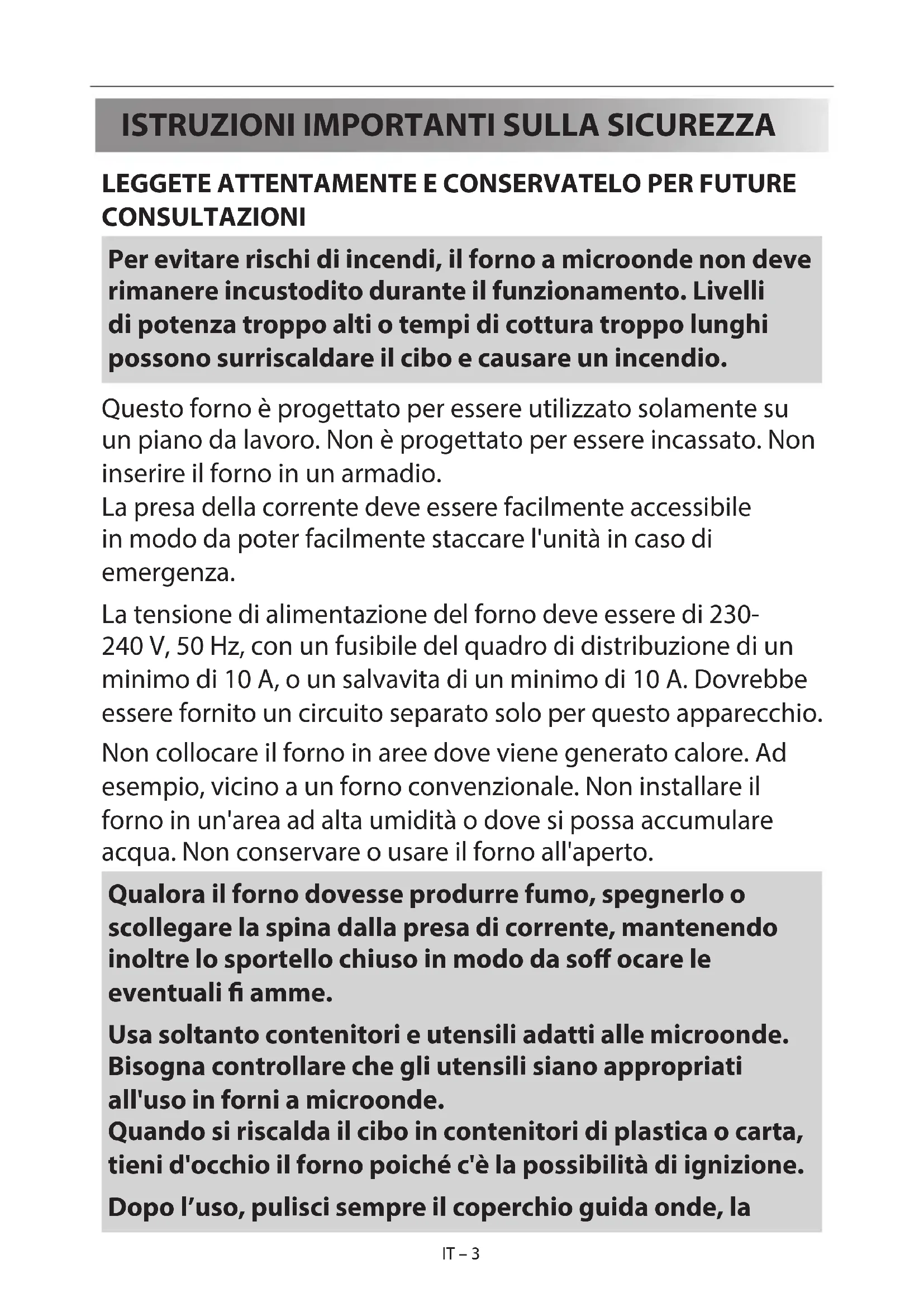 CONSULTAZIONI Per evitare rischi di incendi, il forno a microonde non deve rimanere incustodito durante il funzionamento. Livelli di potenza troppo alti o tempi di cottura troppo lunghi possono surriscaldare il cibo e causare un incendio. Questo forno è progettato per essere utilizzato solamente su un piano da lavoro. Non è progettato per essere incassato. Non inserire il forno in un armadio. La presa della corrente deve essere facilmente accessibile in modo da poter facilmente staccare l'unità in caso di emergenza. La tensione di alimentazione del forno deve essere di 230- 240 V, 50Hz, con un fusibile del quadro di distribuzione di un minimo di 10 A, o un salvavita di un minimo di 10 A. Dovrebbe essere fornito un circuito separato solo per questo apparecchio. Non collocare il forno in aree dove viene generato calore. Ad esempio, vicino a un forno convenzionale. Non installare il forno in un'area ad alta umidità o dove si possa accumulare acqua. Non conservare o usare il forno all'aperto. Qualora il forno dovesse produrre fumo, spegnerlo o scollegare la spina dalla presa di corrente, mantenendo inoltre lo sportello chiuso in modo da soff ocare le eventuali amme. Usa soltanto contenitori e utensili adatti alle microonde. Bisogna controllare che gli utensili siano appropriati all'uso in forni a microonde. Quando si riscalda il cibo in contenitori di plastica o carta, tieni d'occhio il forno poiché c'è la possibilità di ignizione. Dopo l’uso, pulisci sempre il coperchio guida onde, laIT IT – 4 IT – 4 cavità del forno, il piatto rotante: devono essere asciutti e senza tracce di grasso. Gli accumuli di grasso possono surriscaldarsi, fumare o in ammarsi. Non mettere materiali in ammabili vicino al forno o alle aperture di ventilazione. Non ostruire le aperture di ventilazione. Rimuovi tutti i sigilli di metallo, chiusure in l di ferro ecc. dal cibo e della confezioni. Gli archi elettrici sulle super ci metalliche potrebbero causare un incendio. Non usare il forno a microonde per scaldare l'olio per la frittura. La temperatura non può essere controllata e l'olio potrebbe in ammarsi. Per preparare i popcorn, usa soltanto prodotti per la preparazione dei popcorn destinati al microonde. Non conservare cibo od oggetti all’interno del forno. Controllare le impostazioni dopo aver avviato il forno, per accertarsi che esso funzioni nel modo desiderato. Non lasciare il forno senza supervisione mentre è in funzione. Per evitare surriscaldamento o incendio, prestare molta attenzione alla cottura o al riscaldamento di cibi che contengono molto zucchero o sostanze grasse, quali ad esempio salsicce, pasticci di carne o dolci. Leggi i suggerimenti corrispondenti nel manuale d'uso. Per evitare il rischio di lesioni. ATTENZIONE: Non usare il forno se è danneggiato o non funziona normalmente. Controllare quanto segue prima di continuare ad usarlo: a) Assicurarsi che lo sportello si chiuda correttamente e che non sia fuori sesto o deformato. b) Controllare per assicurarsi che i cardini e i blocchi di sicurezza dello sportello non siano rotti o allentati.IT – 5 IT – 5 c) Assicurarsi che le guarnizioni e le super ci di tenuta dello sportello non siano danneggiate. d) Assicurarsi che l'interno del forno o lo sportello non siano ammaccati. e) Assicurarsi che il cavo di alimentazione e la sua spina non siano danneggiati. Lo sportello o le relative guarnizioni si danneggiano, non usate il forno sino all’avvenuta riparazione da parte di personale competente. Non cercare mai di adattare, riparare o modi care il forno da soli. Qualsiasi intervento di assistenza o riparazione dell’apparecchio che richieda la rimozione della copertura di protezione dall’esposizione diretta alle microonde deve essere eff ettuato esclusivamente da personale specializzato. Non mettere in funzione il forno con lo sportello aperto né alterare la serratura di sicurezza del forno in alcun modo. Non azionare il forno in caso sia presente un oggetto tra le guarnizioni dello sportello e le super ci isolanti. Non fare in modo che grasso o sporco si formino sulle guarnizioni e le parti adiacenti. Pulire regolarmente il forno e togliete i residui di cibo. Seguire le istruzioni per "Pulizia e cura". La mancata pulizia del forno potrebbe danneggiare la super cie e quindi in uire sulla durata dell'elettrodomestico e creare situazioni pericolose. Chi porta uno PACEMAKER deve rivolgersi al medico o al fabbricante del pacemaker riguardo alle precauzioni da prendere per l’uso del forno a microonde. Per evitare il rischio di scosse elettriche.