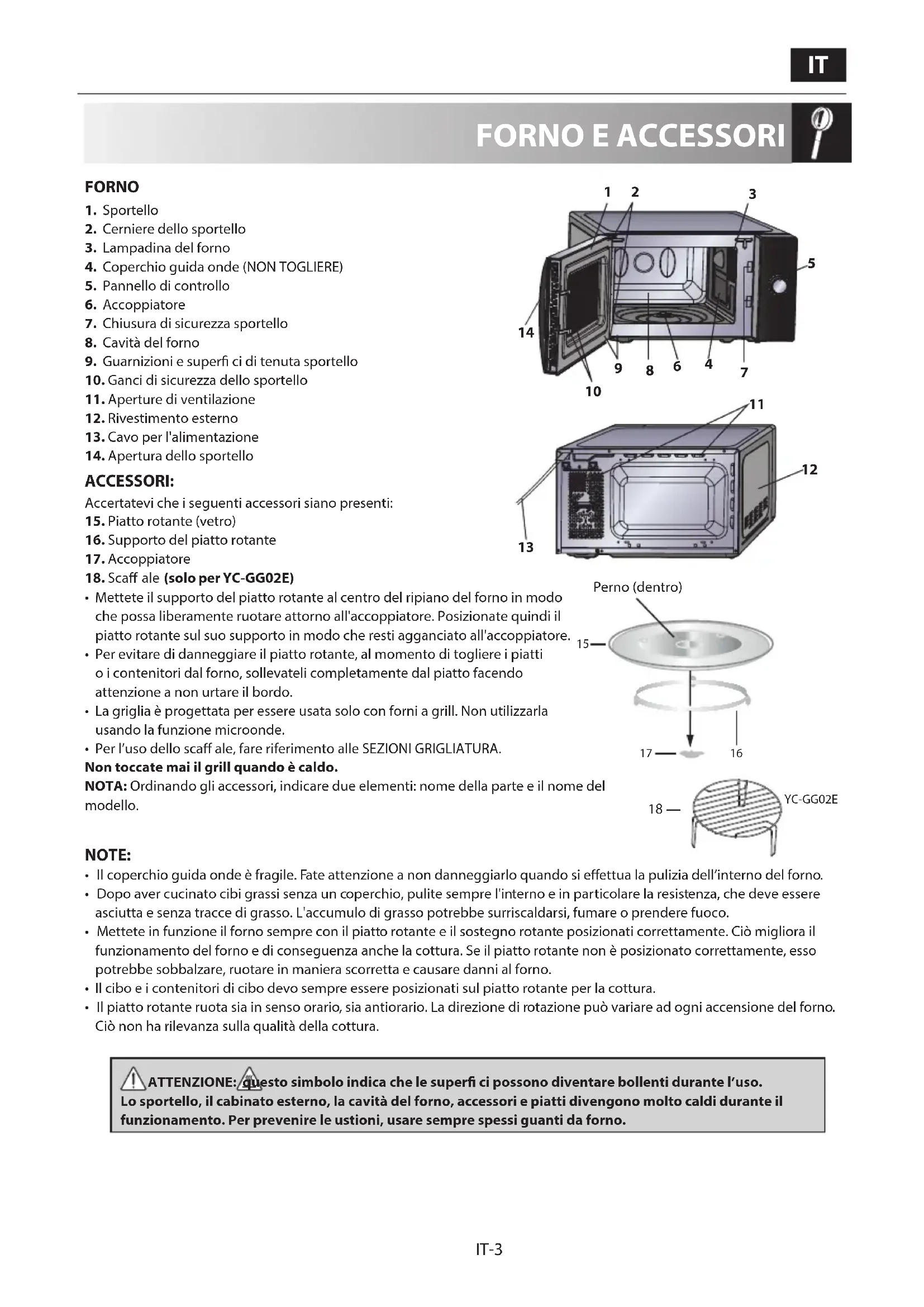 FORNO 1. Sportello2. Cerniere dello sportello3. Lampadina del forno4. Coperchio guida onde (NON TOGLIERE)5. Pannello di controllo6. Accoppiatore7. Chiusura di sicurezza sportello8. Cavità del forno9. Guarnizioni e super ci di tenuta sportello10. Ganci di sicurezza dello sportello11. Aperture di ventilazione12. Rivestimento esterno13. Cavo per l'alimentazione14. Apertura dello sportello ACCESSORI: Accertatevi che i seguenti accessori siano presenti:15. Piatto rotante (vetro)16. Supporto del piatto rotante17. Accoppiatore18. Scaff ale (solo per YC-GG02E)• Mettete il supporto del piatto rotante al centro del ripiano del forno in modo che possa liberamente ruotare attorno all'accoppiatore. Posizionate quindi il piatto rotante sul suo supporto in modo che resti agganciato all'accoppiatore.• Per evitare di danneggiare il piatto rotante, al momento di togliere i piatti o i contenitori dal forno, sollevateli completamente dal piatto facendo attenzione a non urtare il bordo. • La griglia è progettata per essere usata solo con forni a grill. Non utilizzarla usando la funzione microonde.• Per l’uso dello scaff ale, fare riferimento alle SEZIONI GRIGLIATURA.Non toccate mai il grill quando è caldo.NOTA: Ordinando gli accessori, indicare due elementi: nome della parte e il nome del modello. NOTE:
