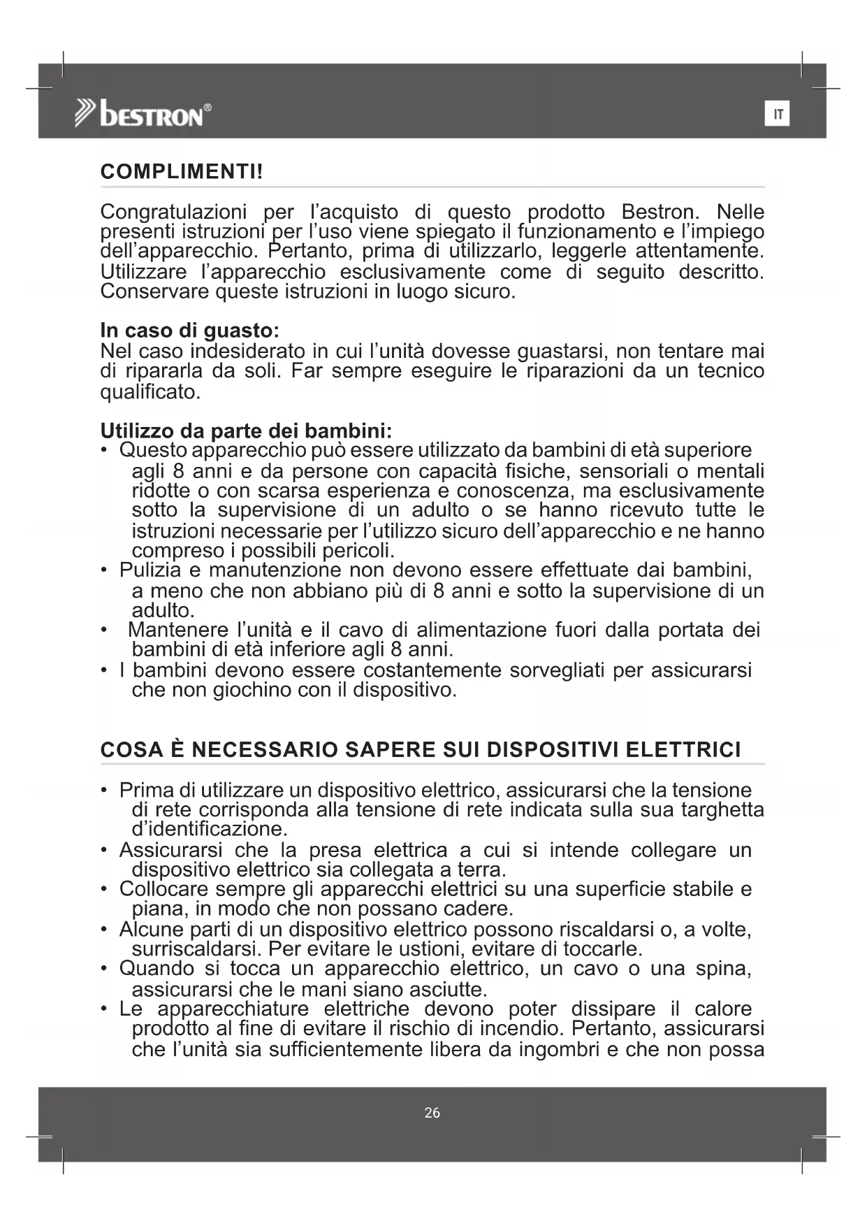 ENCOMPLIMENTI! Congratulazioni per l’acquisto di questo prodotto Bestron. Nelle presenti istruzioni per l’uso viene spiegato il funzionamento e l’impiego dell’apparecchio. Pertanto, prima di utilizzarlo, leggerle attentamente. Utilizzare l’apparecchio esclusivamente come di seguito descritto. Conservare queste istruzioni in luogo sicuro. In caso di guasto: Nel caso indesiderato in cui l’unità dovesse guastarsi, non tentare mai di ripararla da soli. Far sempre eseguire le riparazioni da un tecnico qualificato. Utilizzo da parte dei bambini: