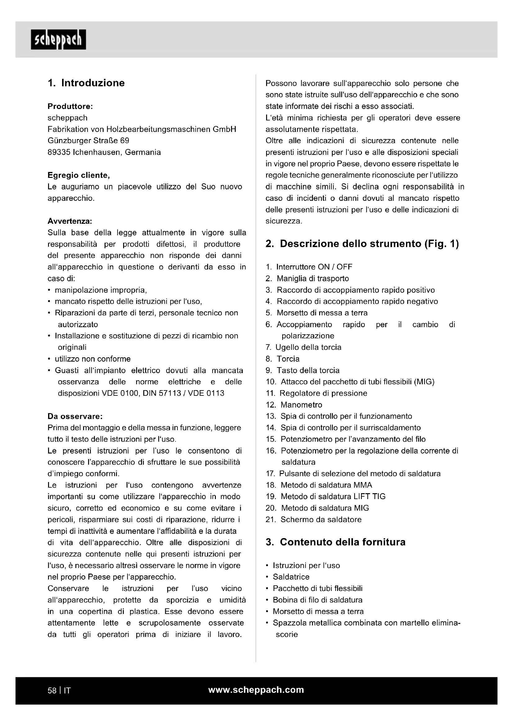 Produttore: scheppach Fabrikation von Holzbearbeitungsmaschinen GmbH Günzburger Straße 69 89335 Ichenhausen, Germania Egregio cliente, Le auguriamo un piacevole utilizzo del Suo nuovo apparecchio. Avvertenza: Sulla base della legge attualmente in vigore sulla responsabilità per prodotti difettosi, il produttore del presente apparecchio non risponde dei danni all‘apparecchio in questione o derivanti da esso in caso di: