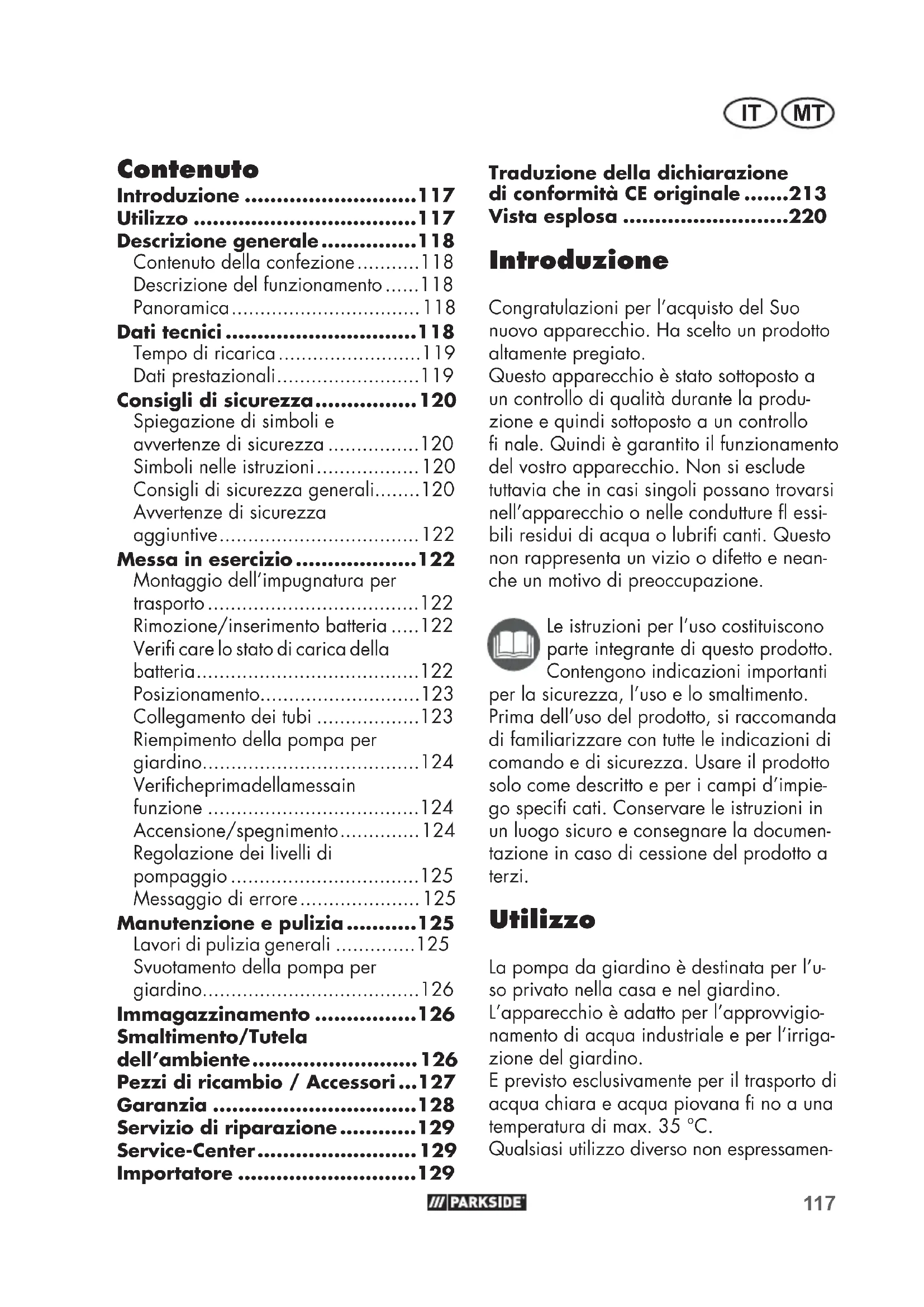- Introduzione Congratulazioni per l’acquisto del Suo nuovo apparecchio. Ha scelto un prodotto altamente pregiato. Questo apparecchio è stato sottoposto a un controllo di qualità durante la produ- zione e quindi sottoposto a un controllo nale. Quindi è garantito il funzionamento del vostro apparecchio. Non si esclude tuttavia che in casi singoli possano trovarsi nell’apparecchio o nelle condutture essi- bili residui di acqua o lubri canti. Questo non rappresenta un vizio o difetto e nean- che un motivo di preoccupazione. Le istruzioni per l’uso costituiscono parte integrante di questo prodotto. Contengono indicazioni importanti per la sicurezza, l’uso e lo smaltimento. Prima dell’uso del prodotto, si raccomanda di familiarizzare con tutte le indicazioni di comando e di sicurezza. Usare il prodotto solo come descritto e per i campi d’impie- go speci cati. Conservare le istruzioni in un luogo sicuro e consegnare la documen- tazione in caso di cessione del prodotto a terzi. Utilizzo La pompa da giardino è destinata per l’u- so privato nella casa e nel giardino. L’apparecchio è adatto per l’approvvigio- namento di acqua industriale e per l’irriga- zione del giardino. E previsto esclusivamente per il trasporto di acqua chiara e acqua piovana no a una temperatura di max. 35°C. Qualsiasi utilizzo diverso non espressamen- Contenuto Introduzione p. 117