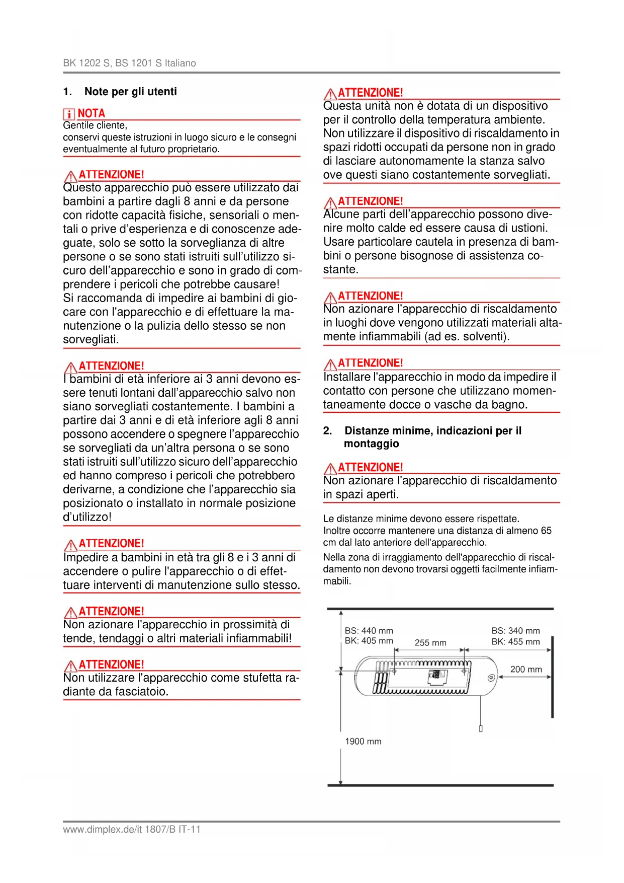 BS: 440 mm BK: 405 mm 255 mm 1900 mm 200 mm BS: 340 mm BK: 455 mmIT-12 1807/B www.dimplex.de/it Italiano BK 1202 S, BS 1201 S L'apparecchio di riscaldamento deve essere installato in orizzontale su una parete verticale, come mostrato in figura. L'altezza minima di montaggio è di 1,8 metri. Non sono consentiti il montaggio a soffitto e in verti- cale. In sede di montaggio è obbligatorio rispettare le aree protette ai sensi delle norme di installazione vigenti. L'apparecchio non deve essere montato direttamente sotto una presa a muro. La cessione del calore da parte dell'apparecchio può far scurire la superficie sulla quale è montato. NOTA È consentito il montaggio su pareti in legno. Rimuovere i supporti di sicurezza per il trasporto