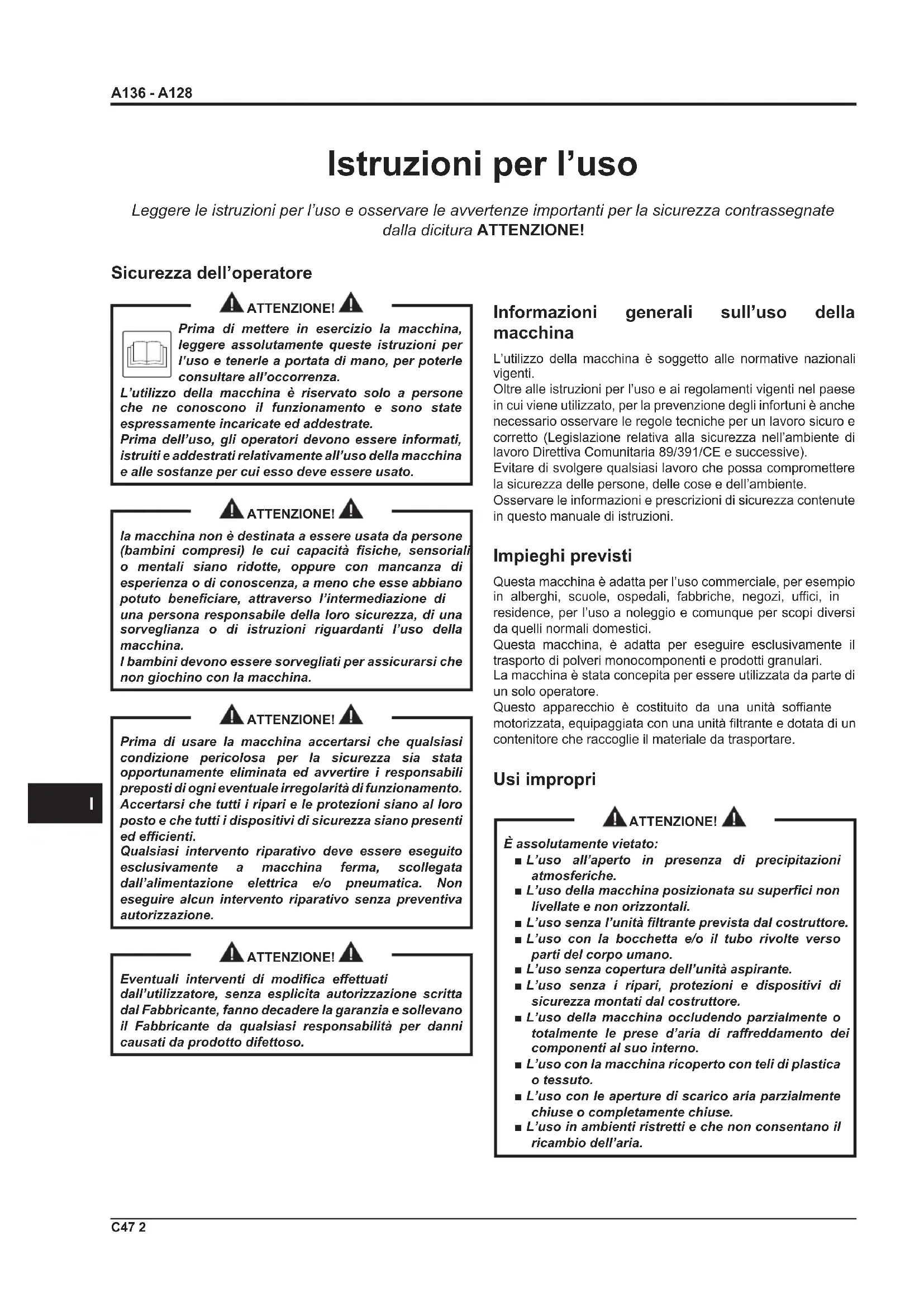Istruzioni per l’uso Informazioni generali sull’uso della macchina L’utilizzo della macchina è soggetto alle normative nazionali vigenti. Oltre alle istruzioni per l’uso e ai regolamenti vigenti nel paese in cui viene utilizzato, per la prevenzione degli infortuni è anche necessario osservare le regole tecniche per un lavoro sicuro e corretto (Legislazione relativa alla sicurezza nell’ambiente di lavoro Direttiva Comunitaria 89/391/CE e successive). Evitare di svolgere qualsiasi lavoro che possa compromettere la sicurezza delle persone, delle cose e dell’ambiente. Osservare le informazioni e prescrizioni di sicurezza contenute in questo manuale di istruzioni. Impieghi previsti Questa macchina è adatta per l’uso commerciale, per esempio in alberghi, scuole, ospedali, fabbriche, negozi, uci, in residence, per l’uso a noleggio e comunque per scopi diversi da quelli normali domestici. Questa macchina, è adatta per eseguire esclusivamente il trasporto di polveri monocomponenti e prodotti granulari. La macchina è stata concepita per essere utilizzata da parte di un solo operatore. Questo apparecchio è costituito da una unità soante motorizzata, equipaggiata con una unità ltrante e dotata di un contenitore che raccoglie il materiale da trasportare. Usi impropri ATTENZIONE! È assolutamente vietato: ■ L’uso all’aperto in presenza di precipitazioni atmosferiche. ■ L’uso della macchina posizionata su superci non livellate e non orizzontali. ■ L’uso senza l’unità ltrante prevista dal costruttore. ■ L’uso con la bocchetta e/o il tubo rivolte verso parti del corpo umano. ■ L’uso senza copertura dell’unità aspirante. ■ L’uso senza i ripari, protezioni e dispositivi di sicurezza montati dal costruttore. ■ L’uso della macchina occludendo parzialmente o totalmente le prese d’aria di rareddamento dei componenti al suo interno. ■ L’uso con la macchina ricoperto con teli di plastica o tessuto. ■ L’uso con le aperture di scarico aria parzialmente chiuse o completamente chiuse. ■ L’uso in ambienti ristretti e che non consentano il ricambio dell’aria. Leggere le istruzioni per l’uso e osservare le avvertenze importanti per la sicurezza contrassegnate dalla dicitura ATTENZIONE! Sicurezza dell’operatore ATTENZIONE! Prima di mettere in esercizio la macchina, leggere assolutamente queste istruzioni per l’uso e tenerle a portata di mano, per poterle consultare all’occorrenza. L’utilizzo della macchina è riservato solo a persone che ne conoscono il funzionamento e sono state espressamente incaricate ed addestrate. Prima dell’uso, gli operatori devono essere informati, istruiti e addestrati relativamente all’uso della macchina e alle sostanze per cui esso deve essere usato. ATTENZIONE! la macchina non è destinata a essere usata da persone (bambini compresi) le cui capacità siche, sensoriali o mentali siano ridotte, oppure con mancanza di esperienza o di conoscenza, a meno che esse abbiano potuto beneciare, attraverso l’intermediazione di una persona responsabile della loro sicurezza, di una sorveglianza o di istruzioni riguardanti l’uso della macchina. I bambini devono essere sorvegliati per assicurarsi che non giochino con la macchina. ATTENZIONE! Prima di usare la macchina accertarsi che qualsiasi condizione pericolosa per la sicurezza sia stata opportunamente eliminata ed avvertire i responsabili preposti di ogni eventuale irregolarità di funzionamento. Accertarsi che tutti i ripari e le protezioni siano al loro posto e che tutti i dispositivi di sicurezza siano presenti ed ecienti. Qualsiasi intervento riparativo deve essere eseguito esclusivamente a macchina ferma, scollegata dall’alimentazione elettrica e/o pneumatica. Non eseguire alcun intervento riparativo senza preventiva autorizzazione. ATTENZIONE! Eventuali interventi di modica eettuati dall’utilizzatore, senza esplicita autorizzazione scritta dal Fabbricante, fanno decadere la garanzia e sollevano il Fabbricante da qualsiasi responsabilità per danni causati da prodotto difettoso.A136 - A128 3 C47