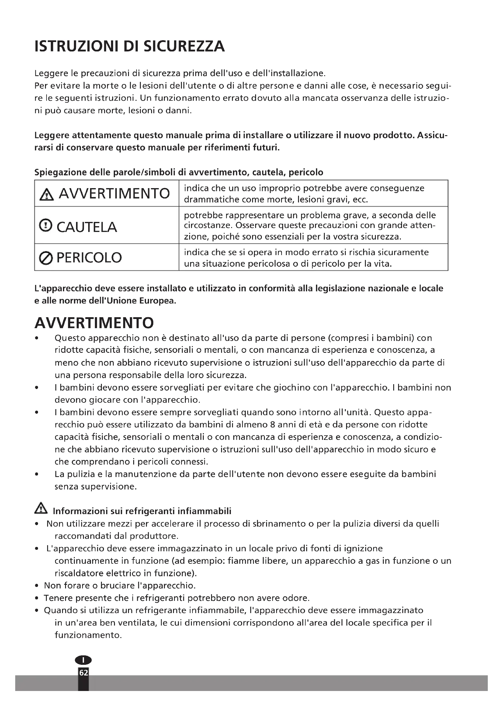 Leggere le precauzioni di sicurezza prima dell'uso e dell'installazione. Per evitare la morte o le lesioni dell'utente o di altre persone e danni alle cose, è necessario segui- re le seguenti istruzioni. Un funzionamento errato dovuto alla mancata osservanza delle istruzio- ni può causare morte, lesioni o danni. Leggere attentamente questo manuale prima di installare o utilizzare il nuovo prodotto. Assicu- rarsi di conservare questo manuale per riferimenti futuri. Spiegazione delle parole/simboli di avvertimento, cautela, pericolo AVVERTIMENTO indica che un uso improprio potrebbe avere conseguenze drammatiche come morte, lesioni gravi, ecc. CAUTELA potrebbe rappresentare un problema grave, a seconda delle circostanze. Osservare queste precauzioni con grande atten- zione, poiché sono essenziali per la vostra sicurezza. PERICOLO indica che se si opera in modo errato si rischia sicuramente una situazione pericolosa o di pericolo per la vita. L'apparecchio deve essere installato e utilizzato in conformità alla legislazione nazionale e locale e alle norme dell'Unione Europea. AVVERTIMENTO