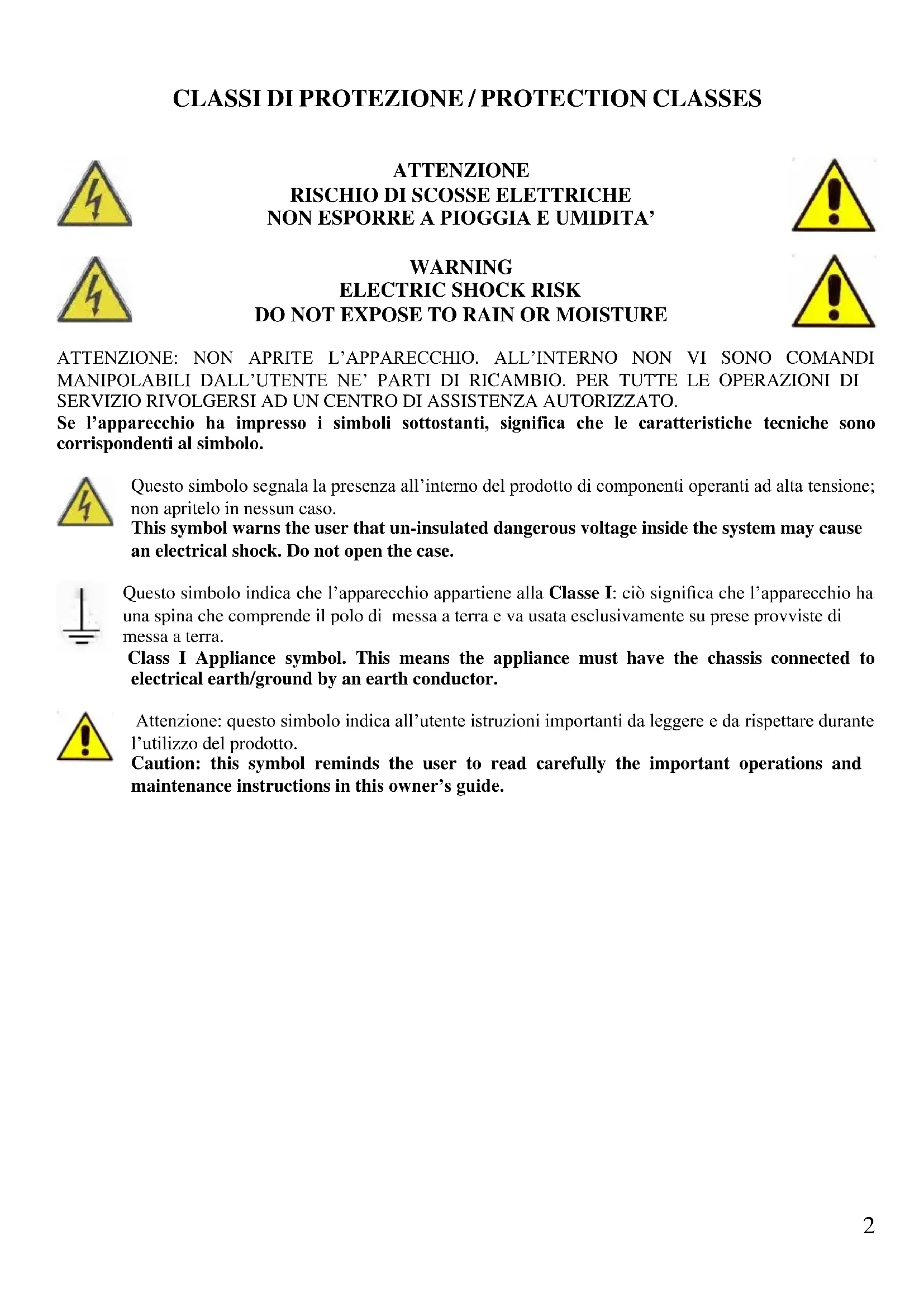 DO NOT EXPOSE TO RAIN OR MOISTURE ATTENZIONE: NON APRITE L’APPARECCHIO. ALL’INTERNO NON VI SONO COMANDI MANIPOLABILI DALL’UTENTE NE’ PARTI DI RICAMBIO. PER TUTTE LE OPERAZIONI DI SERVIZIO RIVOLGERSI AD UN CENTRO DI ASSISTENZA AUTORIZZATO. Se l’apparecchio ha impresso i simboli sottostanti, significa che le caratteristiche tecniche sono corrispondenti al simbolo. Questo simbolo segnala la presenza all’interno del prodotto di componenti operanti ad alta tensione; non apritelo in nessun caso. This symbol warns the user that un-insulated dangerous voltage inside the system may cause an electrical shock. Do not open the case. Questo simbolo indica che l’apparecchio appartiene alla Classe I: ciò significa che l’apparecchio ha una spina che comprende il polo di messa a terra e va usata esclusivamente su prese provviste di messa a terra. Class I Appliance symbol. This means the appliance must have the chassis connected to electrical earth/ground by an earth conductor. Attenzione: questo simbolo indica all’utente istruzioni importanti da leggere e da rispettare durante l’utilizzo del prodotto. Caution: this symbol reminds the user to read carefully the important operations and maintenance instructions in this owner’s guide.3