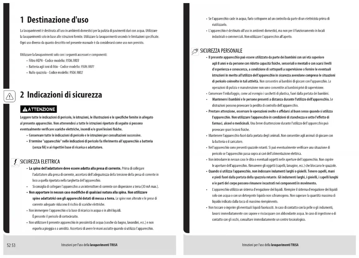 La confezione è realizzata con materiali ecocompatibili che si consiglia di smaltire presso gli impianti di riciclaggio locali. Procedendo allo smaltimento della confezione e dei riuti dell'imballaggio in modo corretto, si contribuisce ad escludere eventuali situazioni di pericolo per l'ambiente e la salute pubblica. Il simbolo sulla confezione indica che l'imballaggio è realizzato con PAP. 11 Garanzia Il presente apparecchio dispone di una garanzia di 5 anni a decorrere dalla data d'acquisto (garanzia per la batteria di 1 anno o di 500 ricariche). Ai sensi della suddetta garanzia si procederà alla sostituzione o alla riparazione dell'apparecchio in caso di vizi materiali di produzione. Non sono previste la sostituzione con un nuovo apparecchio o la restituzione di somme di denaro. La presente garanzia non copre la normale usura, l'impiego commerciale, le alterazioni apportate all'apparecchio acquistato, le attività di pulizia, gli effetti dell'uso improprio o di eventuali danni da parte dell'acquirente o di terze parti, i danni eventualmente dovuti a circostanze esterne o provocati dalle batterie. La garanzia prevede la restituzione a carico dell'acquirente dell'apparecchio difettoso insieme al talloncino di garanzia corredato di data e firma del rivenditore o allo scontrino fiscale. PROBLEMA SOLUZIONE La lavapavimenti non funziona. Accertarsi di aver ricaricato la batteria ed averla installata in modo corretto. Vedere "Preparazione della lavapavimenti". Accertarsi di aver attivato la lavapavimenti. Controllare di aver pulito il rullo spazzola e averlo installato in modo corretto. Non è possibile passare alla modalità Max. Controllare l'eventuale autonomia della batteria inferiore al 20%. NOTA BENE! La modalità Max non è disponibile se l'autonomia della batteria è inferiore al 20%. La pulizia non è corretta. Pulire il rullo spazzola. Pulire il ltro HEPA e il serbatoio dell'acqua sporca. Sostituire il ltro HEPA in caso di un suo utilizzo prolungato. Sostituire il rullo spazzola. Trisa_HardFloorCleaner - INDD - Second Draft.indd 66-67Trisa_HardFloorCleaner - INDD - Second Draft.indd 66-67 29-11-2022 01:04:4729-11-2022 01:04:4768 69 Instructions for use TRISA Hard Floor Cleaner Instructions for use TRISA Hard Floor Cleaner 1 Intended use The hard oor cleaner is intended to be used in a household environment to clean hard oors using water. Only use the hard oor cleaner according to the instructions described. Only use the hard oor cleaner within the specied performing limits. All use other than described in this manual is seen as unintended use.Use the hard oor cleaner with the following accessories and components only:• HEPA Filter - Model number: 9506.9803• Li-ion battery - Model number: 9506.9801• Brush roll - Model number: 9506.9802 2 Safety instructions Read all safety warnings, instructions, illustrations and specifications provided with this appliance. Failure to follow all instructions listed below may result in electric shock, fire and/or serious personal injury. • Save all warnings and instructions for future reference. • The term ”appliance” in the warnings refers to your battery-operated (cordless) appliance and its charging stand and adapter. ELECTRICAL SAFETY