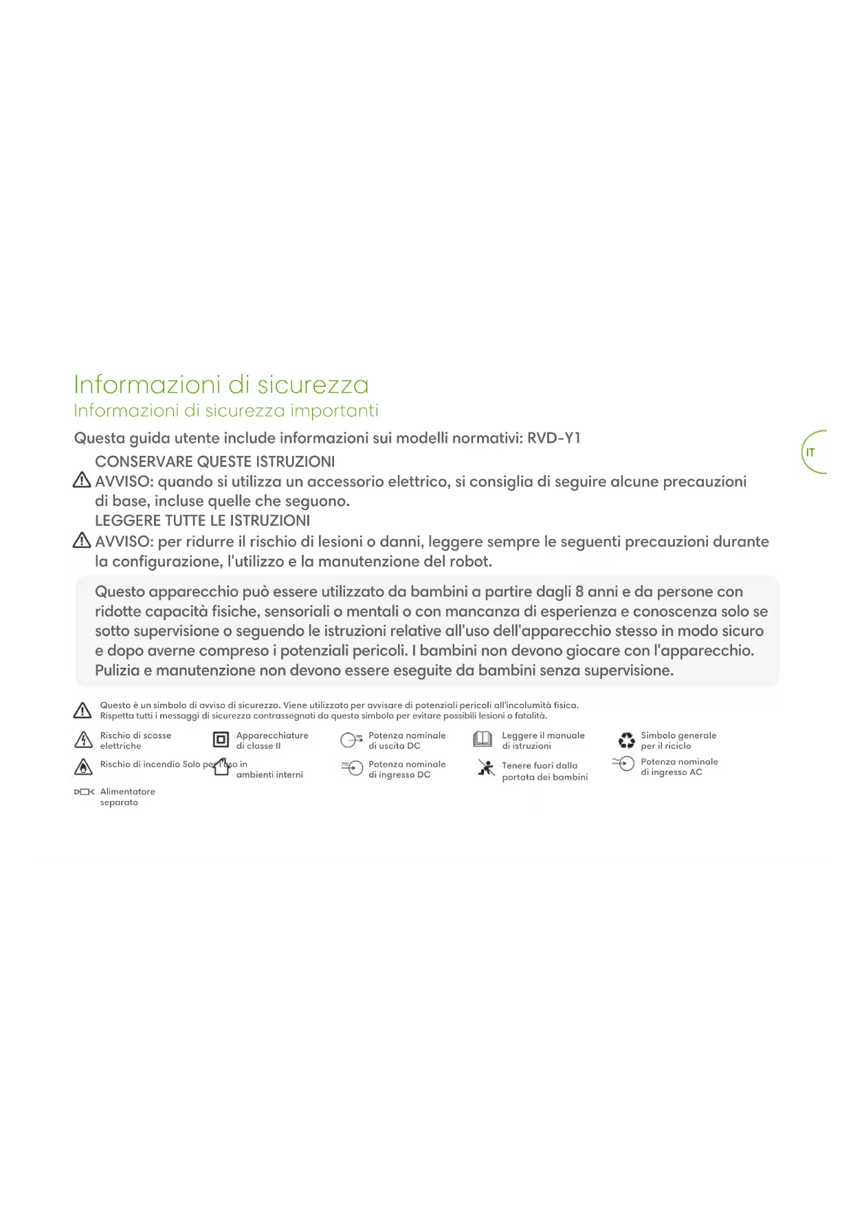 - Ottenere risposte alle domande.• Recapiti dei centri assistenza di zona Assistenza clienti iRobotITIT Con la presente, la società iRobot dichiara che questo robot aspirapolvere modello RVD-Y1 è conforme alla direttiva UE sulle apparecchiature radio 2014/53/UE. Il testo completo della dichiarazione di conformità UE è disponibile al seguente indirizzo Internet: www.irobot.com/compliance. Il report sulle informazioni relative alle sostanze chimiche che elenca SVHC (sostanze estremamente problematiche) ai sensi del regolamento dell'Unione europea UE 1907/2006 è disponibile qui: www.irobot.com/compliance. Questo robot aspirapolvere, modello RVD-Y1, incorpora il modello di modulo radio Azurewave: AXF-Y1. Questo robot aspirapolvere, modello RVD-Y1, opera nella banda WLAN 2,4 GHz. La banda a 2,4 GHz è limitata per operare tra 2412 MHz e 2472 MHz con una potenza di uscita EIRP massima di 19,1 dBm (81,28 mW) a 2442 MHz. ©2021 iRobot Corporation, 8 Crosby Drive, Bedford, MA 01730 USA. Tutti i diritti riservati iRobot, Roomba, iAdapt e Virtual Wall sono marchi registrati di iRobot Corporation. Home Base e Dirt Detect sono marchi di iRobot Corporation. Wi-Fi e il logo Wi-Fi sono marchi registrati di Wi-Fi Alliance. Informazioni sulle normative Posizione Organizzazione URL Austria UFH http://www.elektro-ade.at/elektrogeraete-sammeln/ liste-der-sammelstoesterreich/ Belgio Recupel https://www.recupel.be/en/where-to-go/?search collectionPoints=&categories=1%2C2%2C3%2C4# Germania Zentek https://www.ear-system.de/ear verzeichnis/ sammel-und-ruecknahmestback Danimarca Elretul https://www.dpa- system.dk/DPAApplications/DPADB. aspx?wf=CollectionPointSearch.as Spagna Ecotic https://punto-limpio.info/ Francia Eco-systemes https://www.eco-systemes.fr/france Irlanda RAEE Irlanda http://www.weeeireland.ie/household-recycling/ where-can-i-recycle/ Olanda Wecycle https://www.watismijnapparaatwaard.nl/ Svezia El-Kretsen https://www.sopor.nu/sortera-återvinn/ Regno Unito Repic http://www.responsible-recycling.co.uk/contact-us/ find-your-local-recy Indirizzo del produttore: iRobot Corporation, 8 Crosby Drive Bedford MA 01730, USA Questo simbolo sul prodotto indica che l'apparecchio non deve essere smaltito con rifiuti urbani comuni non dierenziati. In qualità di utenti finali, si ha la responsabilità di smaltire l'apparecchio al termine del ciclo di vita in modo ecologicamente consapevole come segue: (1) restituirlo al distributore/rivenditore da cui è stato acquistato il prodotto; o (2) depositarlo in un punto di raccolta designato. Lo smaltimento corretto di questo prodotto consentirà di risparmiare risorse preziose e di prevenire potenziali eetti negativi sulla salute umana e sull'ambiente, che potrebbero altrimenti derivare da una gestione inadeguata dei rifiuti. Si prega di contattare l'ente locale per ulteriori dettagli o il punto di raccolta designato più vicino. Potrebbero essere applicabili sanzioni per lo smaltimento non corretto di questi rifiuti, in conformità alla legislazione nazionale. Ulteriori informazioni possono essere trovate alla seguente fonte: http://ec.europa.eu/environment/waste/weee/index_en.htm Ricicla la tua fine vita del prodotto iRobot in modo responsabile secondo le normative locali. Di seguito è riportato un elenco delle organizzazioni di riciclaggio dei RAEE contratte da iRobot al momento della vendita del prodotto.DE Dies ist das Sicherheitswarnsymbol. Es weist auf potenzielle Verletzungsgefahren hin. Beachten Sie alle Sicherheitshinweise, die nach diesem Symbol gegeben werden, um Verletzungen oder Todesfälle zu vermeiden. WARNUNG: Bei der Verwendung elektrischer Geräte sollten immer grundlegende Vorsichtsmaßnahmen beachtet werden, darunter: WARNUNG: Lesen und halten Sie die Sicherheitshinweise bei der Einrichtung, Verwendung oder Wartung Ihres Roboters ein, um das Verletzungs- und Schadensrisiko zu verringern. Dieses Gerät kann von Kindern ab 8 Jahren und von Personen mit eingeschränkten körperlichen, sensorischen oder geistigen Fähigkeiten sowie von Personen ohne Erfahrungen und Kenntnisse unter Aufsicht verwendet werden, sofern sie im Vorfeld Anweisungen zur sicheren Verwendung des Geräts erhalten haben und die damit verbundenen Gefahren verstehen. Kinder dürfen nicht mit dem Gerät spielen. Kinder dürfen das Gerät nicht ohne Aufsicht reinigen oder warten. Sicherheitshinweise Wichtige Sicherheitshinweise