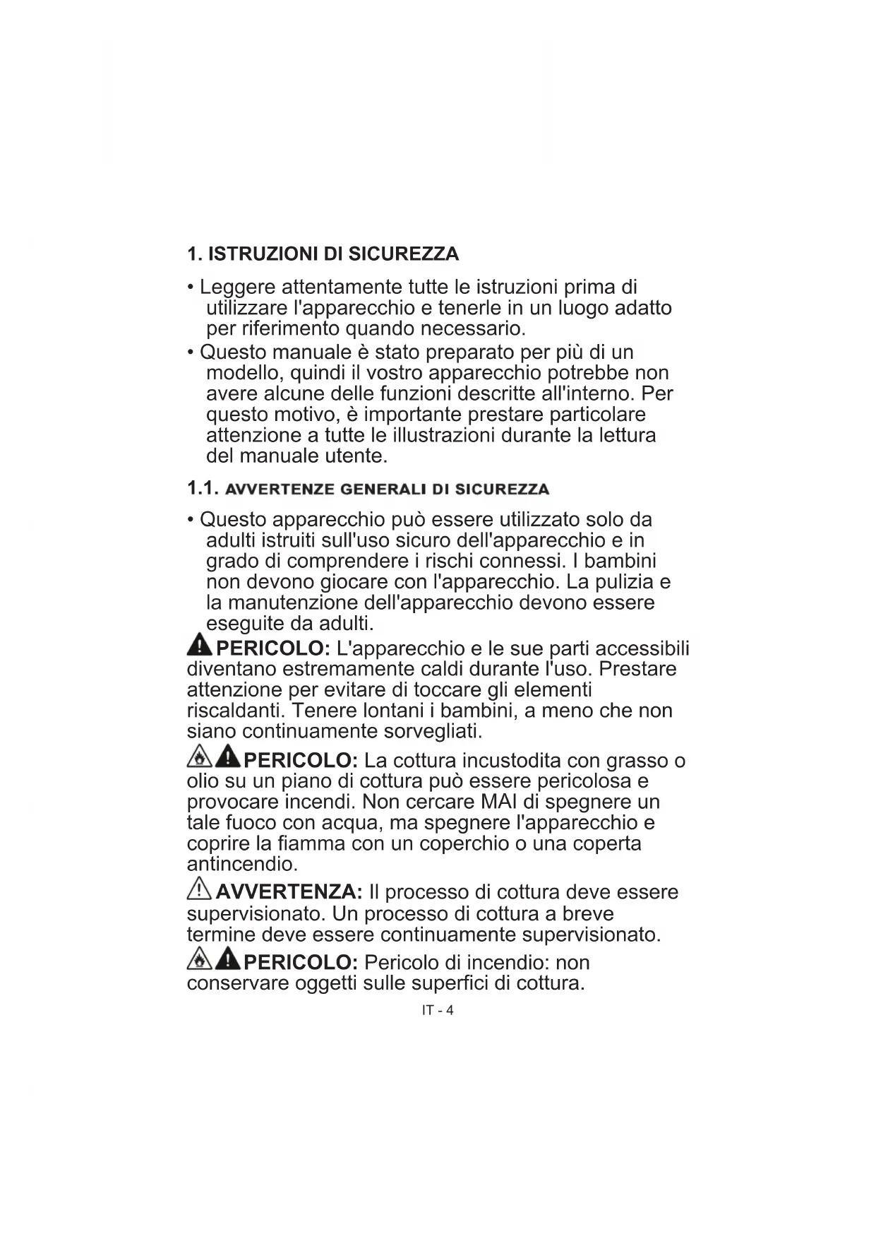 - Questo apparecchio può essere utilizzato solo da adulti istruiti sull'uso sicuro dell'apparecchio e in grado di comprendere i rischi connessi. I bambini non devono giocare con l'apparecchio. La pulizia e la manutenzione dell'apparecchio devono essere eseguite da adulti. PERICOLO: L'apparecchio e le sue parti accessibili diventano estremamente caldi durante l'uso. Prestare attenzione per evitare di toccare gli elementi riscaldanti. Tenere lontani i bambini, a meno che non siano continuamente sorvegliati. PERICOLO: La cottura incustodita con grasso o olio su un piano di cottura può essere pericolosa e provocare incendi. Non cercare MAI di spegnere un tale fuoco con acqua, ma spegnere l'apparecchio e coprire la fiamma con un coperchio o una coperta antincendio. AVVERTENZA: Il processo di cottura deve essere supervisionato. Un processo di cottura a breve termine deve essere continuamente supervisionato. PERICOLO: Pericolo di incendio: non conservare oggetti sulle superfici di cottura.IT - 5 PERICOLO: Se la superficie è incrinata, spegnere l'apparecchio per evitare la possibilità di scosse elettriche.