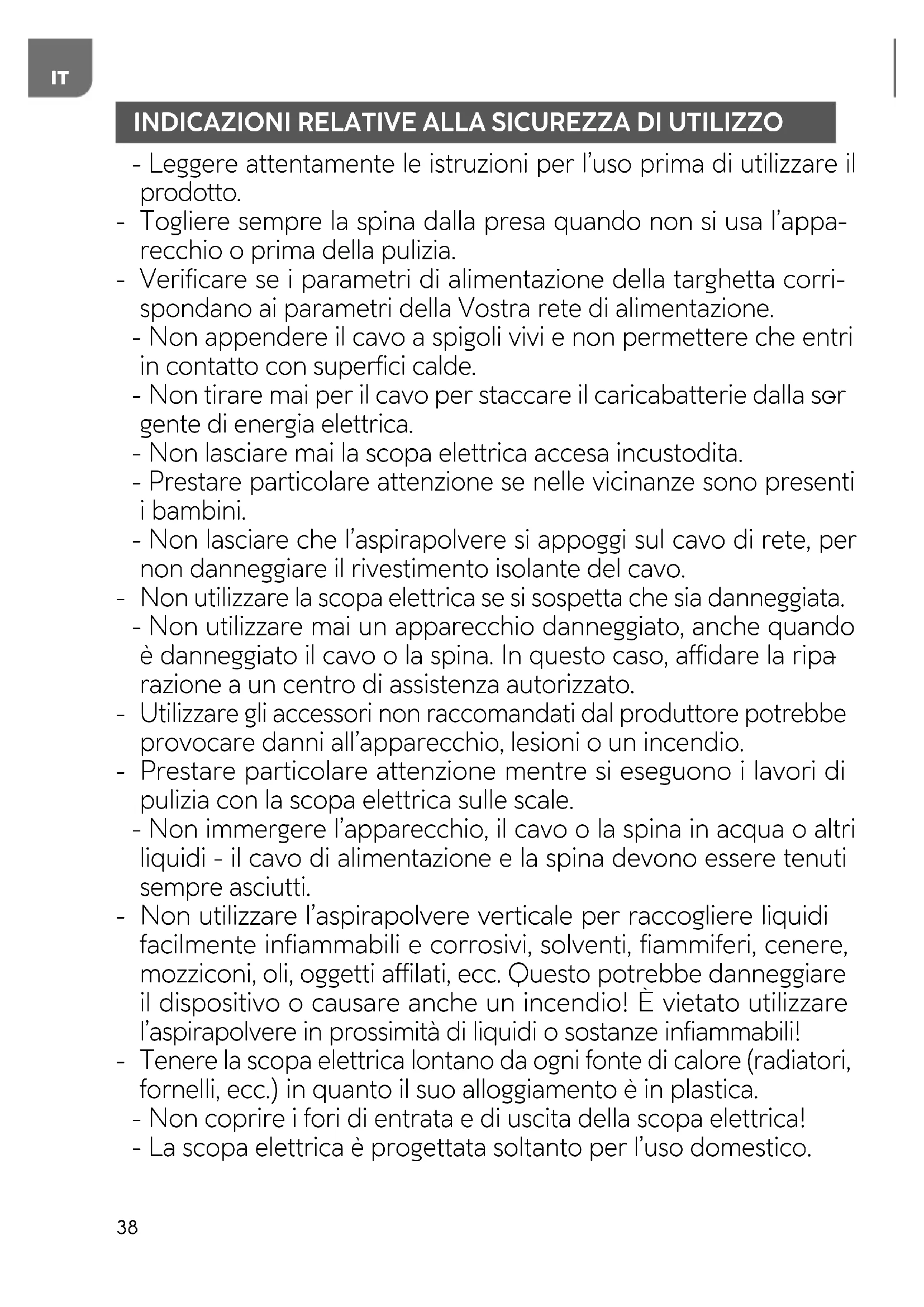 gente di energia elettrica. - Non lasciare mai la scopa elettrica accesa incustodita. - Prestare particolare attenzione se nelle vicinanze sono presenti i bambini. - Non lasciare che l’aspirapolvere si appoggi sul cavo di rete, per non danneggiare il rivestimento isolante del cavo.