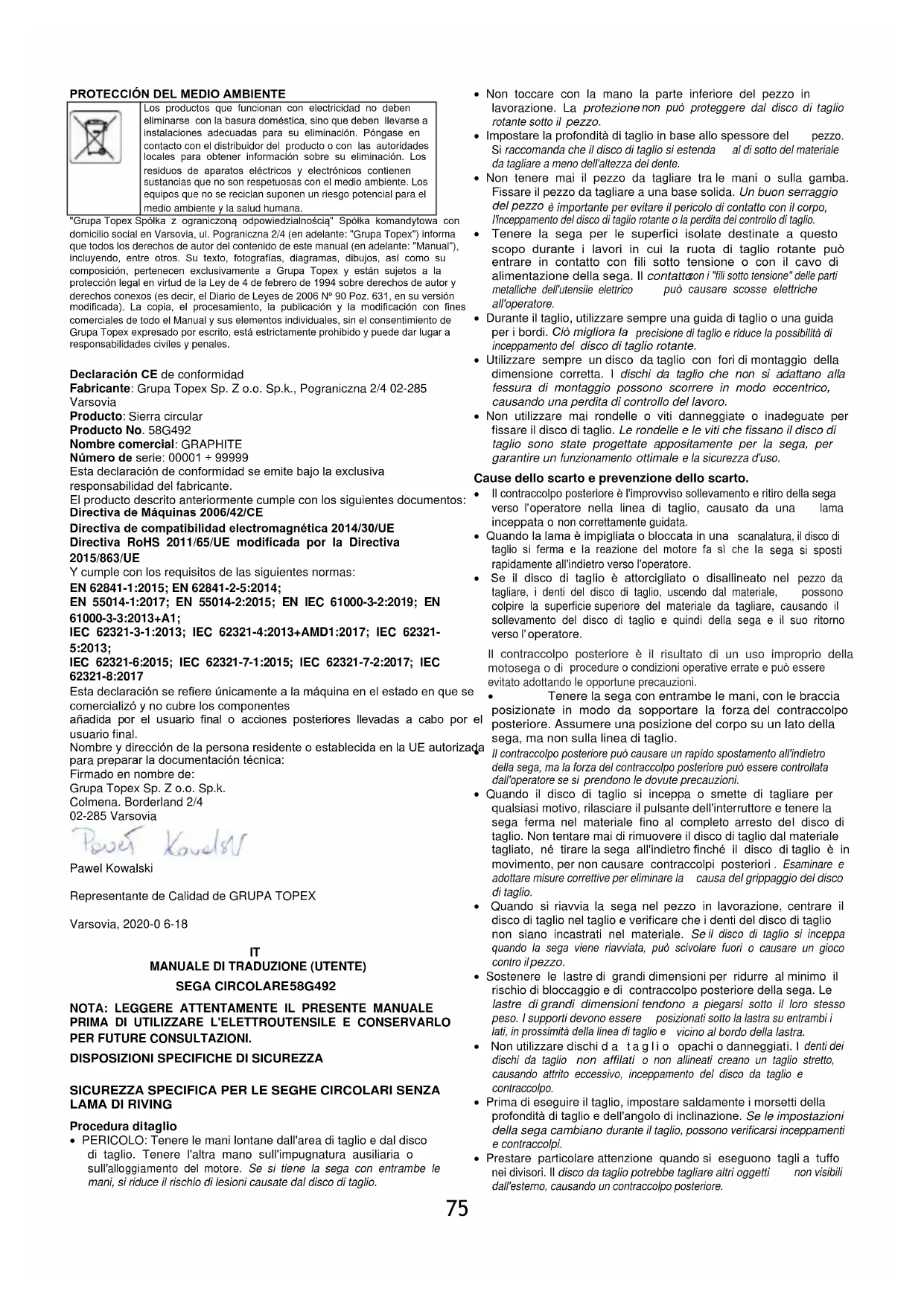 I prodotti alimentati elettricamente non devono essere smaltiti con i rifiuti domestici, ma devono essere portati in strutture adeguate per lo smaltimento. Per informazioni sullo smaltimento, rivolgersi al rivenditore del prodotto o alle autorità locali. I rifiuti di apparecchiature elettriche ed elettroniche contengono sostanze che non rispettano l'ambiente. Le apparecchiature non riciclate rappresentano un rischio potenziale per l'ambiente e la salute umana. "Grupa Topex Spółka z ograniczoną odpowiedzialnością". Spółka komandytowa con sede legale a Varsavia, ul. Pograniczna 2/4 (di seguito: "Grupa Topex") informa che tutti i diritti d'autore sul contenuto del presente manuale (di seguito: "Manuale"), compresi, tra gli altri. Il testo, le fotografie, i diagrammi, i disegni e la sua composizione appartengono esclusivamente a Grupa Topex e sono tutelati dalla legge del 4 febbraio 1994 sul diritto d'autore e sui diritti connessi (Gazzetta Ufficiale 2006 n. 90 Poz. 631 e successive modifiche). La copia, l'elaborazione, la pubblicazione, la modifica a fini commerciali dell'intero Manuale e dei suoi singoli elementi, senza il consenso di Grupa Topex espresso per iscritto, è severamente vietata e può comportare responsabilità civili e penali. Dichiarazione CE di conformità Produttore: Grupa Topex Sp. Z o.o. Sp.k., Pograniczna 2/4 02-285 Warsaw Prodotto: Sega circolare articolo n.: 58G492 Nome commerciale: GRAPHITE N. di serie: 00001 ÷ 99999 Questa dichiarazione di conformità è rilasciata sotto l'esclusiva responsabilità del fabbricante. Il prodotto sopra descritto è conforme ai seguenti documenti: Direttiva Macchine 2006/42/CE Direttiva sulla compatibilità elettromagnetica 2014/30/UE Direttiva RoHS 2011/65/UE modificata dalla direttiva 2015/863/UE E soddisfa i requisiti dei seguenti standard: EN 62841-1:2015; EN 62841-2-5:2014; EN 55014-1:2017; EN 55014-2:2015; EN IEC 61000-3-2:2019; EN 61000-3-3:2013+A1; IEC 62321-3-1:2013; IEC 62321-4:2013+AMD1:2017; IEC 62321- 5:2013; IEC 62321-6:2015; IEC 62321-7-1:2015; IEC 62321-7-2:2017; IEC 62321-8:2017 Questa dichiarazione si riferisce solo alla macchina nello stato in cui è stata immessa sul mercato e non copre i componenti aggiunte dall'utente finale o azioni successive eseguite dall'utente finale. Nome e indirizzo della persona residente o stabilita nell'UE autorizzata a preparare la documentazione tecnica: Firmato per conto di: Grupa Topex Sp. Z o.o. Sp.k. Alveare. Borderland 2/4 02-285 Varsavia Pawel Kowalski Rappresentante di qualità di GRUPA TOPEX Varsavia, 2020-0 6-18