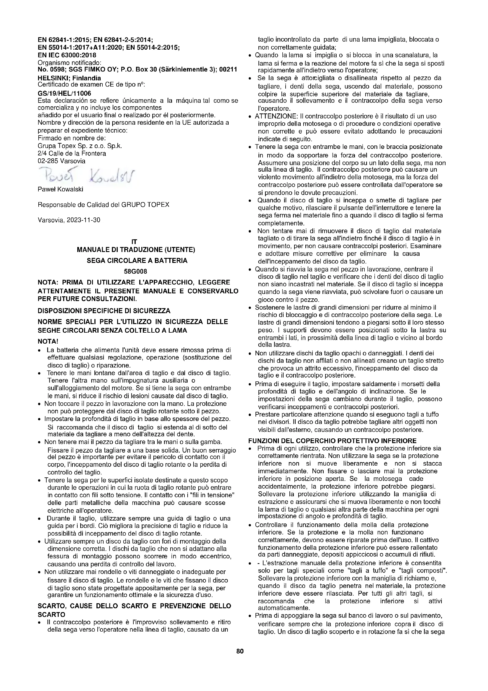 I prodotti alimentati elettricamente non devono essere smaltiti con i rifiuti domestici, ma devono essere portati nelle apposite strutture di smaltimento. Per informazioni sullo smaltimento, rivolgersi al rivenditore del prodotto o alle autorità locali. I rifiuti di apparecchiature elettriche ed elettroniche contengono sostanze inerti per l'ambiente. Le apparecchiature non riciclate rappresentano un rischio potenziale per l'ambiente e la salute umana. "Grupa Topex Spółka z ograniczoną odpowiedzialnością". Spółka komandytowa con sede legale a Varsavia, ul. Pograniczna 2/4 (di seguito: "Grupa Topex") informa che tutti i diritti d'autore sul contenuto del presente manuale (di seguito: "Manuale"), compresi, tra gli altri. Il testo, le fotografie, i diagrammi, i disegni e la sua composizione appartengono esclusivamente a Grupa Topex e sono tutelati dalla legge del 4 febbraio 1994 sul diritto d'autore e sui diritti connessi (Gazzetta Ufficiale 2006 n. 90 Poz. 631, e successive modifiche). La copia, l'elaborazione, la pubblicazione, la modifica a fini commerciali dell'intero Manuale e dei suoi singoli elementi, senza il consenso di Grupa Topex espresso per iscritto, è severamente vietata e può comportare responsabilità civili e penali. Dichiarazione di conformità CE Produttore: Grupa Topex Sp. z o.o. Sp.k., Pograniczna 2/4 02-285 Warszawa Prodotto: Sega circolare a batteria Modello: 58G008 Nome commerciale: GRAFITE Numero di serie: 00001 ÷ 99999 La presente dichiarazione di conformità è rilasciata sotto l'esclusiva responsabilità del produttore. Il prodotto sopra descritto è conforme ai seguenti documenti: Direttiva macchine 2006/42/CE Direttiva sulla compatibilità elettromagnetica 2014/30/UE Direttiva RoHS 2011/65/UE, modificata dalla direttiva 2015/863/UE. E soddisfa i requisiti degli standard: EN 62841-1:2015; EN 62841-2-5:2014; EN 55014-1:2017+A11:2020; EN 55014-2:2015; EN IEC 63000:2018 Organismo notificato: N. 0598; SGS FIMKO OY; P.O. Box 30 (Särkiniementie 3); 00211 HELSINKI; Finlandia Certificato di esame CE del tipo n: GS/19/HEL/11006 La presente dichiarazione si riferisce esclusivamente alla macchina così come immessa sul mercato e non include i componenti aggiunte dall'utente finale o eseguite da lui successivamente. Nome e indirizzo della persona residente nell'UE autorizzata a preparare il fascicolo tecnico: Firmato a nome di: Grupa Topex Sp. z o.o. Sp.k. 2/4 Via del Confine 02-285 Varsavia Paweł Kowalski Responsabile della qualità del gruppo TOPEX Varsavia, 2023-11-30
