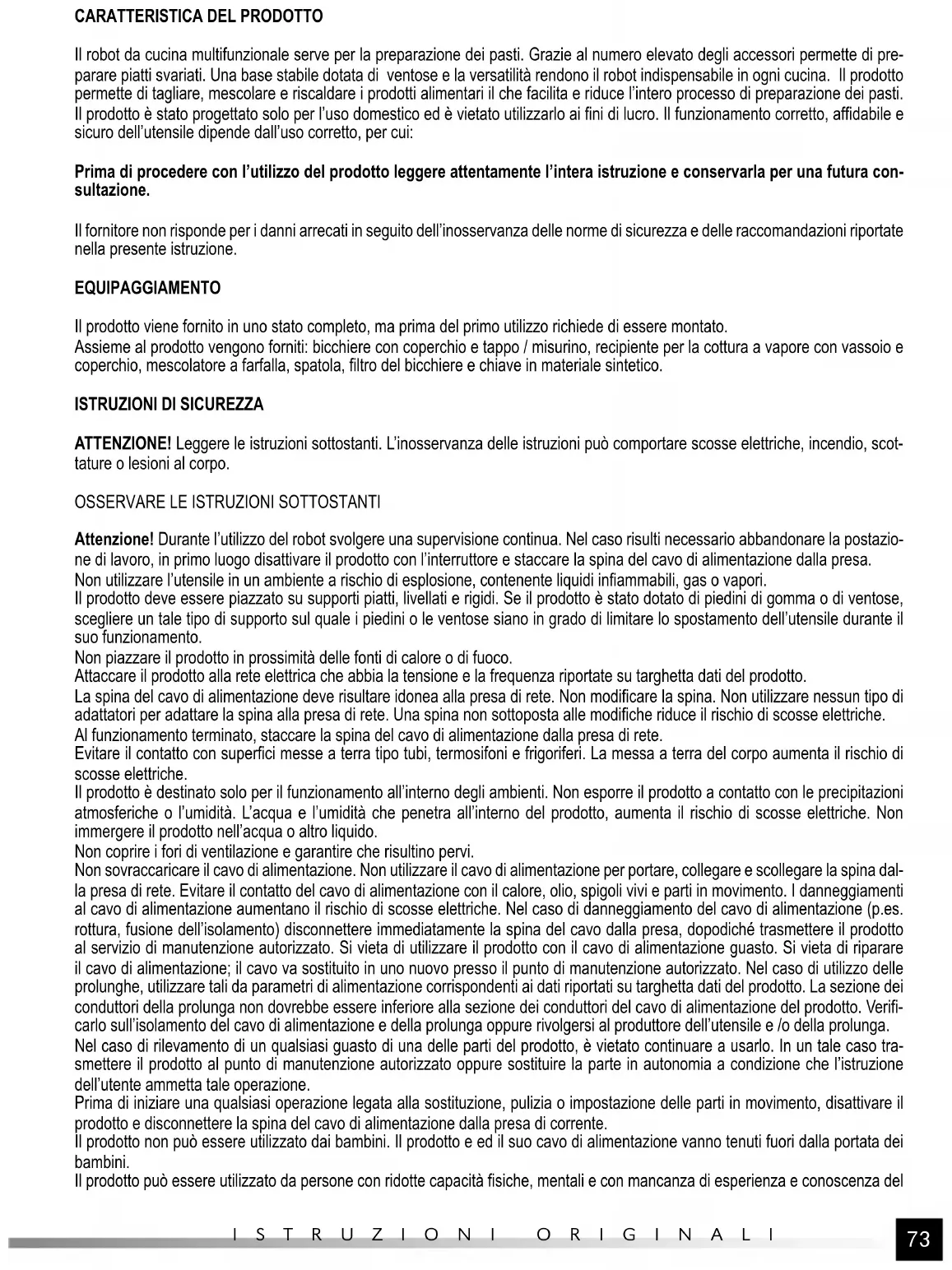 dispositivo, a condizione che il suo uso venga supervisionato o accompagnato da istruzioni riguardanti l’uso in sicurezza, così che i rischi associati risultino chiari. I bambini non devono giocare con il prodotto. I bambini non sorvegliati non dovrebbero eseguire la pulizia e la manutenzione del prodotto. Il prodotto è destinato solo per l’uso domestico. Il prodotto contiene elementi affilati (lama del bicchiere) per cui agire con cautela durante il montaggio, lo smontaggio e la pulizia degli accessori. Il prodotto può riscaldarsi fino a temperature elevate per cui agire con cautela al funzionamento terminato che richiedeva l’utilizzo di temperature elevate. Utilizzare guanti e abbigliamento protettivo.