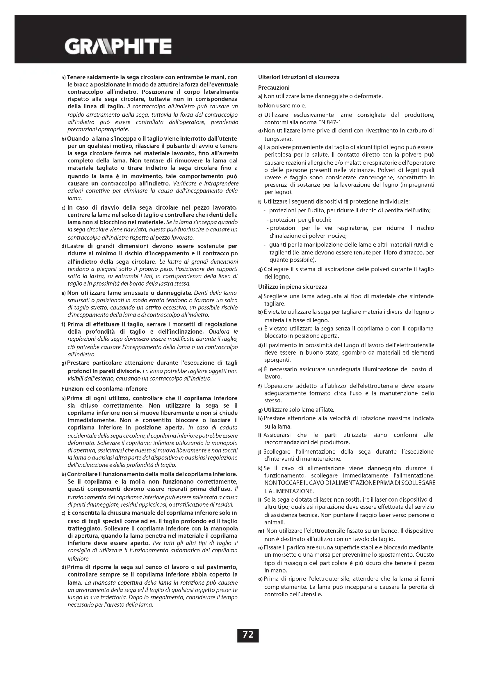 - Se la supercie della lama è ondeggiata o questa è stata posizionata erroneamente nell’elemento tagliato, i denti della lama dopo l’uscita dal materiale lavorato, possono colpire la supercie superiore del materiale tagliato, causando il sollevamento della lama e della sega circolare e causando un contraccolpo in direzione dell’operatore. Il contraccolpo all’indietro si verica in seguito ad un uso improprio della sega circolare o all’esecuzione di procedure errate, o a seguito dell’impiego in condizioni inappropriate, e può essere evitato prendendo precauzioni appropriate.72 a) Tenere saldamente la sega circolare con entrambe le mani, con le braccia posizionate in modo da attutire la forza dell’eventuale contraccolpo all’indietro. Posizionare il corpo lateralmente rispetto alla sega circolare, tuttavia non in corrispondenza della linea di taglio. Il contraccolpo all’indietro può causare un rapido arretramento della sega, tuttavia la forza del contraccolpo all’indietro può essere controllata dall’operatore, prendendo precauzioni appropriate. b) Quando la lama s’inceppa o il taglio viene interrotto dall’utente per un qualsiasi motivo, rilasciare il pulsante di avvio e tenere la sega circolare ferma nel materiale lavorato, no all’arresto completo della lama. Non tentare di rimuovere la lama dal materiale tagliato o tirare indietro la sega circolare no a quando la lama è in movimento, tale comportamento può causare un contraccolpo all’indietro. Vericare e intraprendere azioni correttive per eliminare la causa dell’inceppamento della lama. c) In caso di riavvio della sega circolare nel pezzo lavorato, centrare la lama nel solco di taglio e controllare che i denti della lama non si blocchino nel materiale. Se la lama s’inceppa quando la sega circolare viene riavviata, questa può fuoriuscire o causare un contraccolpo all’indietro rispetto al pezzo lavorato. d) Lastre di grandi dimensioni devono essere sostenute per ridurre al minimo il rischio d’inceppamento e il contraccolpo all’indietro della sega circolare. Le lastre di grandi dimensioni tendono a piegarsi sotto il proprio peso. Posizionare dei supporti sotto la lastra, su entrambi i lati, in corrispondenza della linea di taglio e in prossimità del bordo della lastra stessa. e) Non utilizzare lame smussate o danneggiate. Denti della lama smussati o posizionati in modo errato tendono a formare un solco di taglio stretto, causando un attrito eccessivo, un possibile rischio d’inceppamento della lama e di contraccolpo all’indietro. f) Prima di eettuare il taglio, serrare i morsetti di regolazione della profondità di taglio e dell’inclinazione. Qualora le regolazioni della sega dovessero essere modicate durante il taglio, ciò potrebbe causare l’inceppamento della lama o un contraccolpo all’indietro. g) Prestare particolare attenzione durante l’esecuzione di tagli profondi in pareti divisorie. La lama potrebbe tagliare oggetti non visibili dall’esterno, causando un contraccolpo all’indietro. Funzioni del coprilama inferiore a) Prima di ogni utilizzo, controllare che il coprilama inferiore sia chiuso correttamente. Non utilizzare la sega se il coprilama inferiore non si muove liberamente e non si chiude immediatamente. Non è consentito bloccare o lasciare il coprilama inferiore in posizione aperta. In caso di caduta accidentale della sega circolare, il coprilama inferiore potrebbe essere deformato. Sollevare il coprilama inferiore utilizzando la manopola di apertura, assicurarsi che questo si muova liberamente e non tocchi la lama o qualsiasi altra parte del dispositivo in qualsiasi regolazione dell’inclinazione e della profondità di taglio. b) Controllare il funzionamento della molla del coprilama inferiore. Se il coprilama e la molla non funzionano correttamente, questi componenti devono essere riparati prima dell’uso. Il funzionamento del coprilama inferiore può essere rallentato a causa di parti danneggiate, residui appiccicosi, o straticazione di residui. c) È consentita la chiusura manuale del coprilama inferiore solo in caso di tagli speciali come ad es. il taglio profondo ed il taglio tratteggiato. Sollevare il coprilama inferiore con la manopola di apertura, quando la lama penetra nel materiale il coprilama inferiore deve essere aperto. Per tutti gli altri tipi di taglio si consiglia di utilizzare il funzionamento automatico del coprilama inferiore. d) Prima di riporre la sega sul banco di lavoro o sul pavimento, controllare sempre se il coprilama inferiore abbia coperto la lama. La mancata copertura della lama in rotazione può causare un arretramento della sega ed il taglio di qualsiasi oggetto presente lungo la sua traiettoria. Dopo lo spegnimento, considerare il tempo necessario per l’arresto della lama. Ulteriori istruzioni di sicurezza Precauzioni a) Non utilizzare lame danneggiate o deformate. b) Non usare mole. c) Utilizzare esclusivamente lame consigliate dal produttore, conformi alla norma EN 847-1. d) Non utilizzare lame prive di denti con rivestimento in carburo di tungsteno. e) La polvere proveniente dal taglio di alcuni tipi di legno può essere pericolosa per la salute. Il contatto diretto con la polvere può causare reazioni allergiche e/o malattie respiratorie dell’operatore o delle persone presenti nelle vicinanze. Polveri di legni quali rovere e faggio sono considerate cancerogene, soprattutto in presenza di sostanze per la lavorazione del legno (impregnanti per legno). f) Utilizzare i seguenti dispositivi di protezione individuale: - protezioni per l’udito, per ridurre il rischio di perdita dell’udito; - protezioni per gli occhi; - protezioni per le vie respiratorie, per ridurre il rischio d’inalazione di polveri nocive; - guanti per la manipolazione delle lame e altri materiali ruvidi e taglienti (le lame devono essere tenute per il foro d’attacco, per quanto possibile). g) Collegare il sistema di aspirazione delle polveri durante il