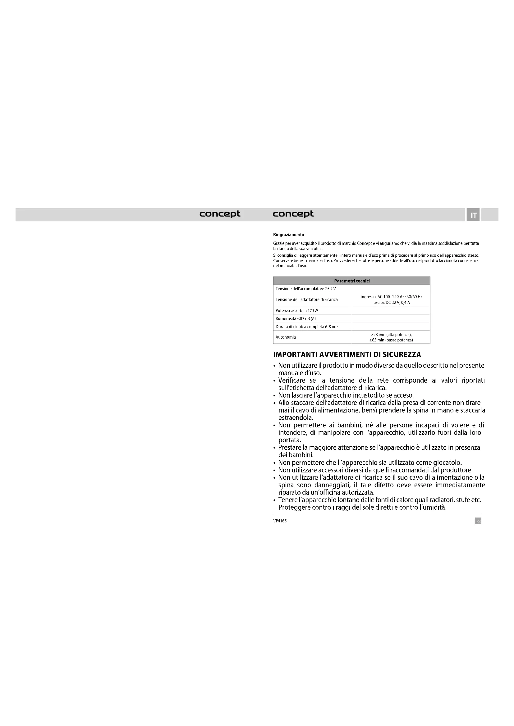 VP4165 Ringraziamento Grazie per aver acquisito il prodotto di marchio Concept e vi auguriamo che vi dia la massima soddisfazione per tutta la durata della sua vita utile. Si consiglia di leggere attentamente l’intero manuale d’uso prima di procedere al primo uso dell’apparecchio stesso. Conservare bene il manuale d’uso. Provvedere che tutte le persone addette all’uso del prodotto facciano la conoscenza del manuale d’uso. Parametri tecnici Tensione dell’accumulatore 25,2 V Tensione dell’adattatore di ricarica ingresso: AC 100–240 V ~ 50/60 Hz uscita: DC 32 V, 0,4 A Potenza assorbita 170 W Rumorosità ≤82 dB (A) Durata di ricarica completa 6-8 ore Autonomia ≥28 min (alta potenza), ≥65 min (bassa potenza)
