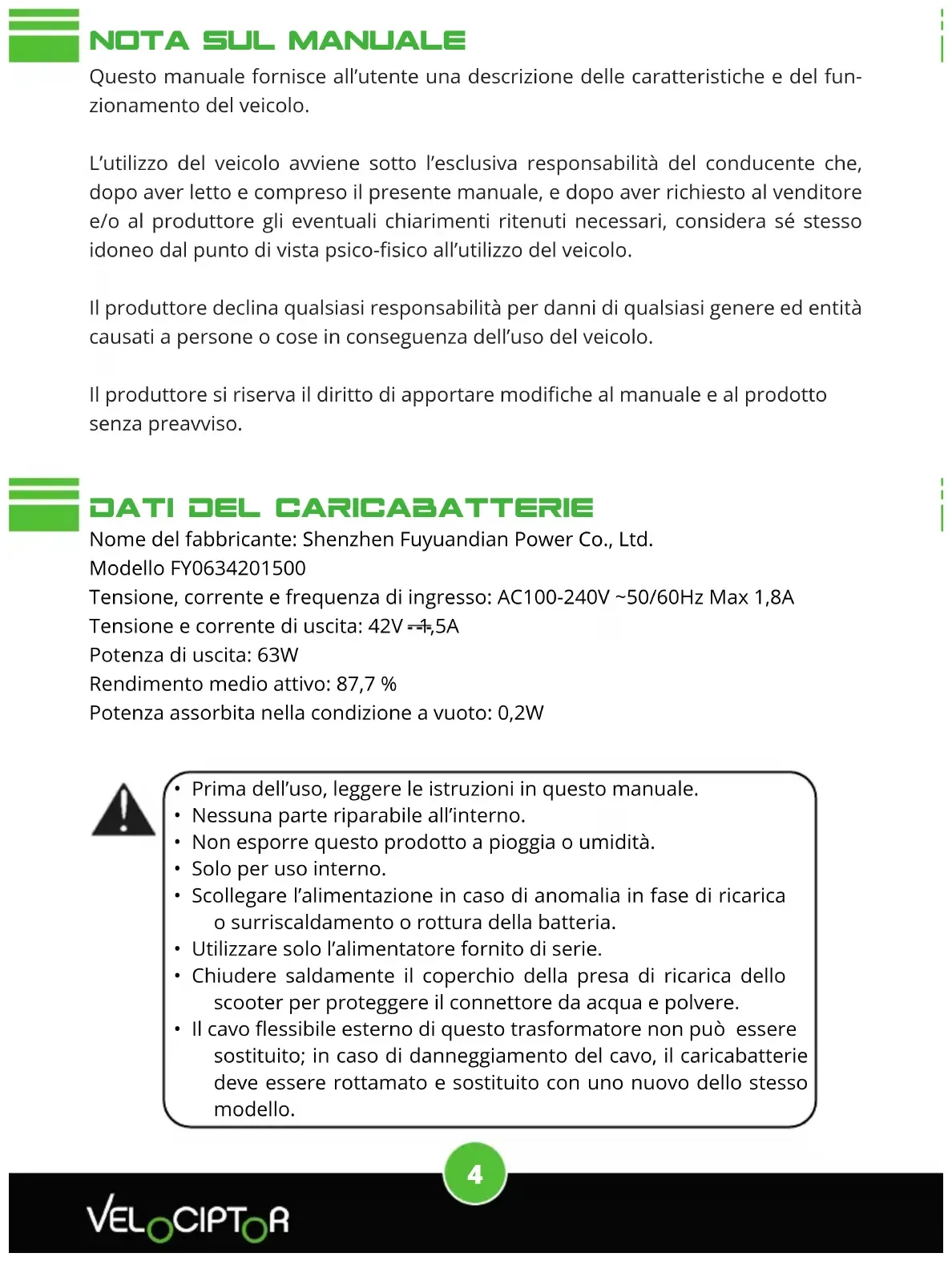 - Il cavo essibile esterno di questo trasformatore non può essere sostituito; in caso di danneggiamento del cavo, il caricabatterie deve essere rottamato e sostituito con uno nuovo dello stesso modello.5 Avvertenze