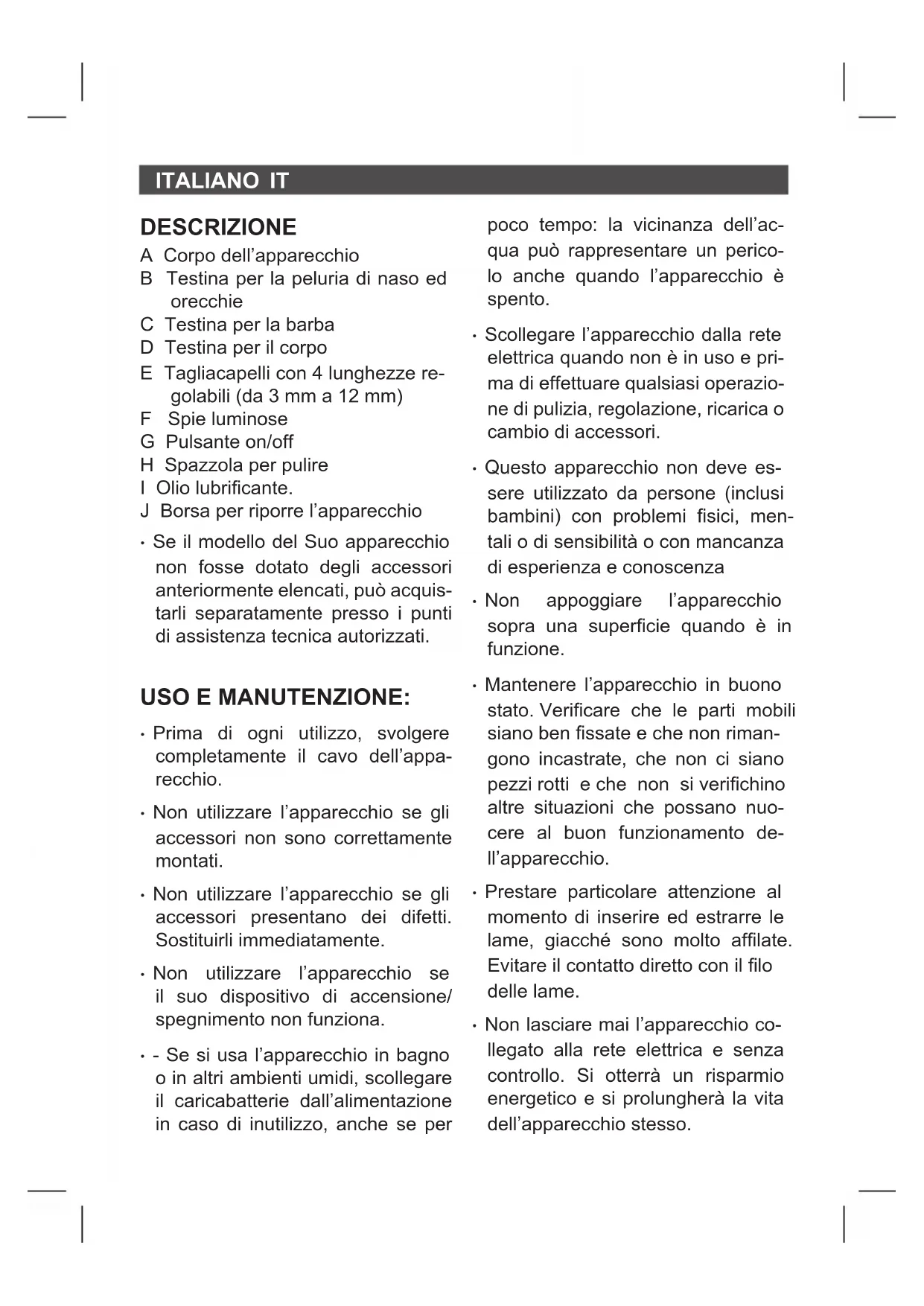 - Se il modello del Suo apparecchio non fosse dotato degli accessori anteriormente elencati, può acquis- tarli separatamente presso i punti di assistenza tecnica autorizzati. USO E MANUTENZIONE: