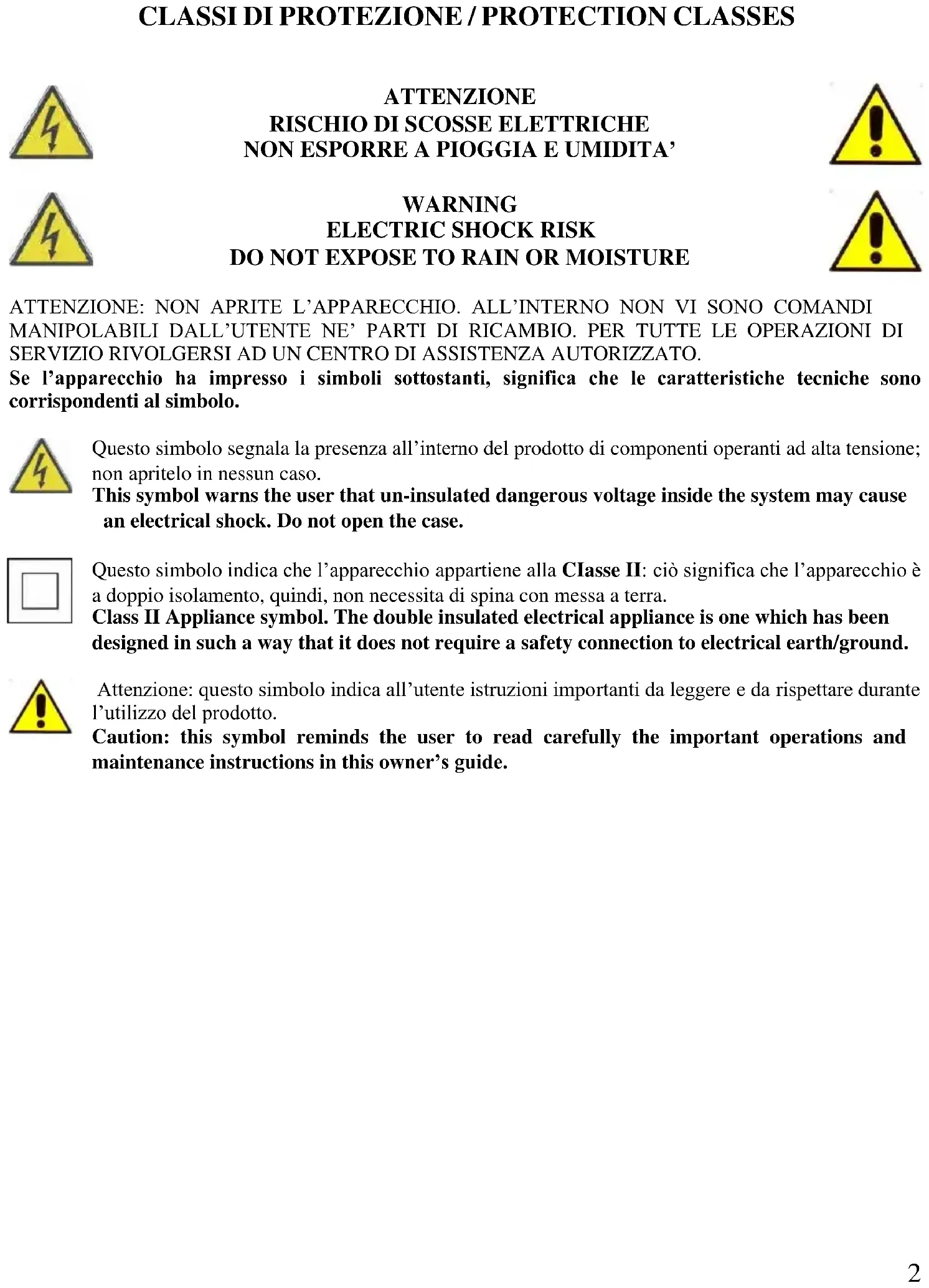DO NOT EXPOSE TO RAIN OR MOISTURE ATTENZIONE: NON APRITE L’APPARECCHIO. ALL’INTERNO NON VI SONO COMANDI MANIPOLABILI DALL’UTENTE NE’ PARTI DI RICAMBIO. PER TUTTE LE OPERAZIONI DI SERVIZIO RIVOLGERSI AD UN CENTRO DI ASSISTENZA AUTORIZZATO. Se l’apparecchio ha impresso i simboli sottostanti, significa che le caratteristiche tecniche sono corrispondenti al simbolo. Questo simbolo segnala la presenza all’interno del prodotto di componenti operanti ad alta tensione; non apritelo in nessun caso. This symbol warns the user that un-insulated dangerous voltage inside the system may cause an electrical shock. Do not open the case. Questo simbolo indica che l’apparecchio appartiene alla CIasse II: ciò significa che l’apparecchio è a doppio isolamento, quindi, non necessita di spina con messa a terra. Class II Appliance symbol. The double insulated electrical appliance is one which has been designed in such a way that it does not require a safety connection to electrical earth/ground. Attenzione: questo simbolo indica all’utente istruzioni importanti da leggere e da rispettare durante l’utilizzo del prodotto. Caution: this symbol reminds the user to read carefully the important operations and maintenance instructions in this owner’s guide.3