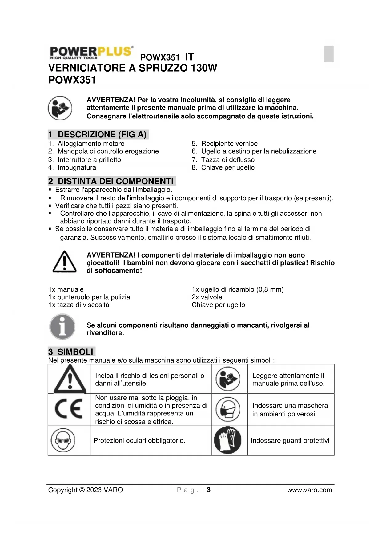 - VENTILAZIONE - Assicurarsi che l‘area di lavoro sia sempre adeguatamente ventilata quando si lavora con la pistola a spruzzo.POWX351 IT Copyright © 2023 VARO P a g . | 6 www.varo.com