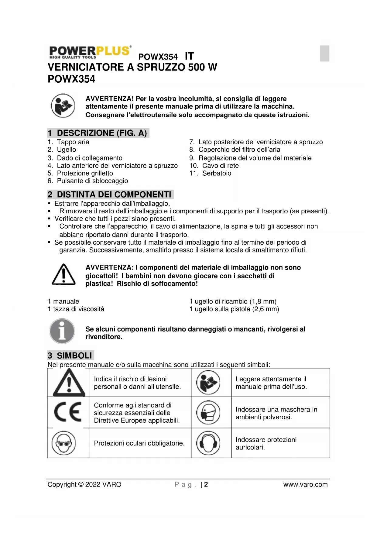 - Quando si lavora con vernici bicomponente, pulire subito l’apparecchio.POWX354 IT Copyright © 2022 VARO P a g . | 8 www.varo.com