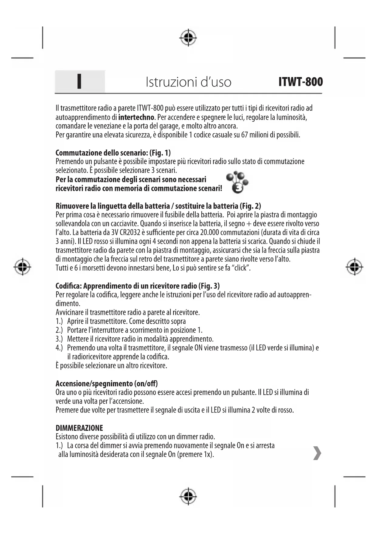 Uputa za rukovanje ITWT-800Il trasmettitore radio a parete ITWT-800 può essere utilizzato per tutti i tipi di ricevitori radio ad autoapprendimento di intertechno. Per accendere e spegnere le luci, regolare la luminosità, comandare le veneziane e la porta del garage, e molto altro ancora. Per garantire una elevata sicurezza, è disponibile 1 codice casuale su 67 milioni di possibili. Commutazione dello scenario: (Fig. 1)Premendo un pulsante è possibile impostare più ricevitori radio sullo stato di commutazione selezionato. È possibile selezionare 3 scenari. Per la commutazione degli scenari sono necessari ricevitori radio con memoria di commutazione scenari! Rimuovere la linguetta della batteria / sostituire la batteria (Fig. 2)Per prima cosa è necessario rimuovere il fusibile della batteria. Poi aprire la piastra di montaggio sollevandola con un cacciavite. Quando si inserisce la batteria, il segno + deve essere rivolto verso l’alto. La batteria da 3V CR2032 è sufficiente per circa 20.000 commutazioni (durata di vita di circa 3 anni). Il LED rosso si illumina ogni 4 secondi non appena la batteria si scarica. Quando si chiude il trasmettitore radio da parete con la piastra di montaggio, assicurarsi che sia la freccia sulla piastra di montaggio che la freccia sul retro del trasmettitore a parete siano rivolte verso l’alto.Tutti e 6 i morsetti devono innestarsi bene, Lo si può sentire se fa “click”.Codifica: Apprendimento di un ricevitore radio (Fig. 3)Per regolare la codifica, leggere anche le istruzioni per l’uso del ricevitore radio ad autoappren-dimento.Avvicinare il trasmettitore radio a parete al ricevitore.1.) Aprire il trasmettitore. Come descritto sopra 2.) Portare l’interruttore a scorrimento in posizione 1.3.) Mettere il ricevitore radio in modalità apprendimento.4.) Premendo una volta il trasmettitore, il segnale ON viene trasmesso (il LED verde si illumina) e il radioricevitore apprende la codifica.È possibile selezionare un altro ricevitore.Accensione/spegnimento (on/off)Ora uno o più ricevitori radio possono essere accesi premendo un pulsante. Il LED si illumina di verde una volta per l’accensione. Premere due volte per trasmettere il segnale di uscita e il LED si illumina 2 volte di rosso.DIMMERAZIONEEsistono diverse possibilità di utilizzo con un dimmer radio. 1.) La corsa del dimmer si avvia premendo nuovamente il segnale On e si arresta alla luminosità desiderata con il segnale On (premere 1x).