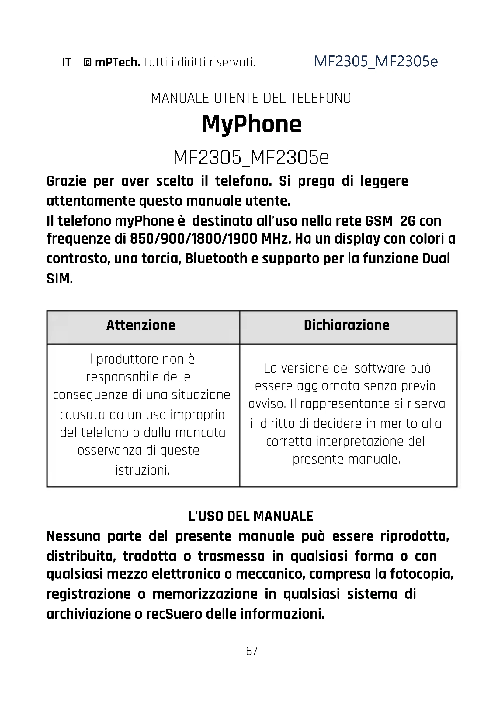 MyPhone MF2305_MF2305e Grazie per aver scelto il telefono. Si prega di leggere attentamente questo manuale utente. Il telefono myPhone è destinato all’uso nella rete GSM 2G con frequenze di 850/900/1800/1900 MHz. Ha un display con colori a contrasto, una torcia, Bluetooth e supporto per la funzione Dual SIM. Attenzione Dichiarazione Il produttore non è responsabile delle conseguenze di una situazione causata da un uso improprio del telefono o dalla mancata osservanza di queste istruzioni. La versione del software può essere aggiornata senza previo avviso. Il rappresentante si riserva il diritto di decidere in merito alla corretta interpretazione del presente manuale.