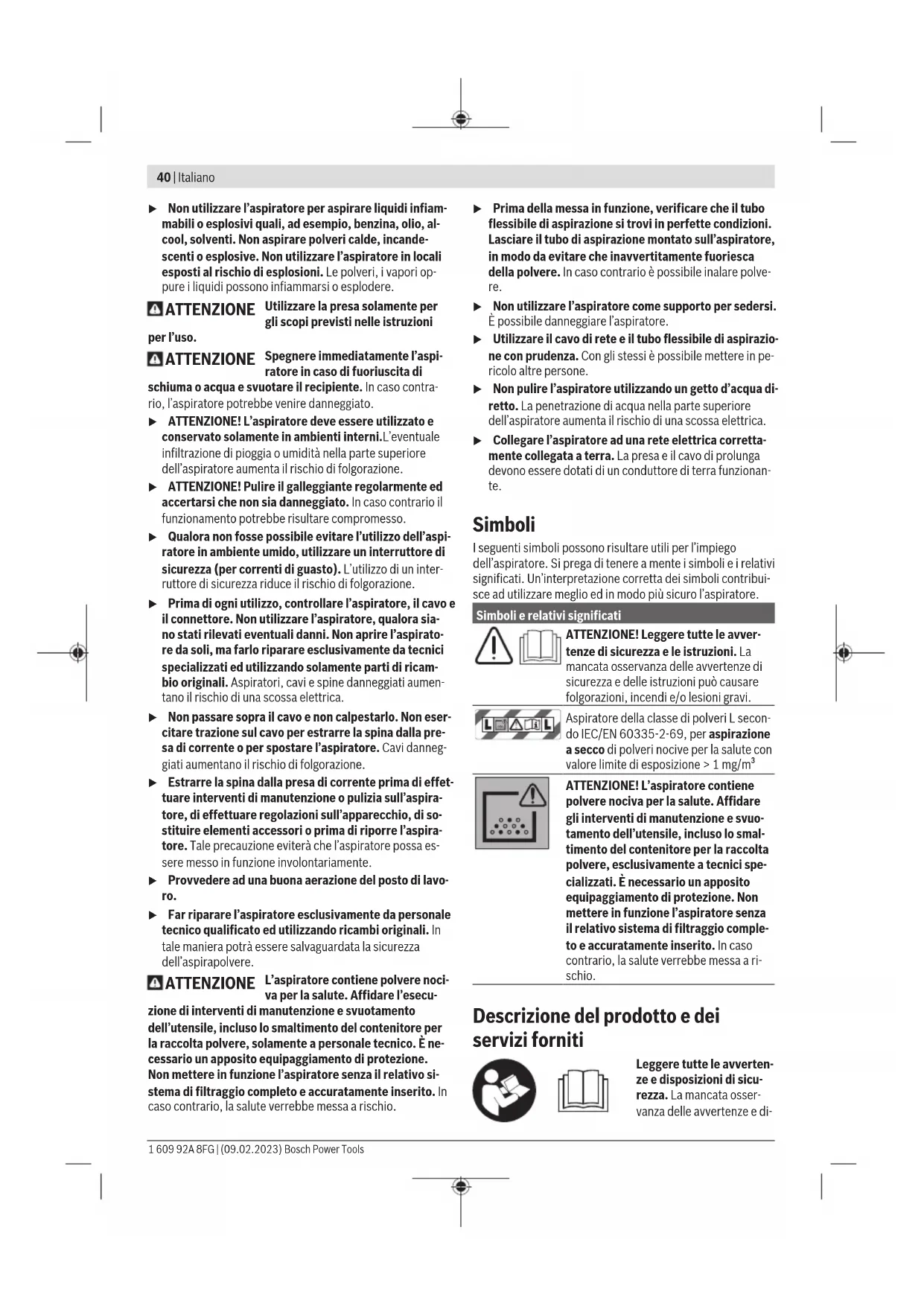 Substitua um filtro com pregas(28) danificado. – Coloque o suporte do filtro(27) no filtro com pregas(28) limpo/novo. – Coloque o suporte do filtro(27) juntamente com o filtro com pregas(28) na parte superior do aspirador e rode o suporte do filtro(27) até ao batente no sentido de rotação . – Coloque a parte superior do filtro (6) e feche os fechos (7). Limpar o flutuador (verfiguraH) Lave ocasionalmente o flutuador(29). – Abra os fechos (7) e retire a parte superior do aspirador (6). – Retire o suporte do filtro(27) juntamente com o filtro com pregas(28) da parte superior do aspirador(6). – Retire o filtro com pregas(28) do suporte do filtro(27). – Lave o flutuador(29) com água. – Coloque novamente o suporte do filtro(27) com o filtro com pregas(28) na parte superior do aspirador(6). – Coloque a parte superior do filtro (6) e feche os fechos (7). Armazenamento e transporte (verfiguraI) – Esvazie e limpe o depósito(1). Para evitar a formação de bolor, certifique-se de que o filtro com pregas(28) e a área interior do aspirador estão secos. – Enrole o cabo de corrente elétrica no suporte para o cabo(13). – Insira os acessórios nos respetivos suportes: adaptador de aspiração(18) no suporte(12), bocal para juntas(23) no suporte(15), bocal para lixo grosseiro(22) no suporte(16). – Coloque a mangueira de aspiração (17) à volta da parte superior do aspirador no suporte (14). – Transporte o aspirador apenas pela pega de transporte (5). – Deposite o aspirador num recinto seco e proteja-o contra utilização não autorizada. – Para travar os roletes de guia(9) pressione o travão dos roletes de guia(10) para baixo. Eliminação de falhas u Se ocorrer uma falha (p. ex. quebra do filtro), o aspirador tem de ser desligado de imediato. A falha tem de ser eliminada antes da nova colocação em funcionamento. Problema Solução A turbina de aspiração não arranca. – Verificar o cabo de corrente elétrica, a ficha de rede, o fusível, a tomada e o flutuador(29). – Prima brevemente a tecla de ligar/desligar (4) ou ligue a ferramenta elétrica(3) conectada à tomada. A turbina de aspiração desliga-se. – Esvaziar o recipiente(1). A turbina de aspiração não arranca depois de se esvaziar o recipiente. – Desligar o aspirador e esperar 5segundos, e depois dos 5segundos voltar a ligar. – Limpar o flutuador(29). O poder de aspiração enfraquece. – Eliminar os entupimentos do bocal de aspiração, do tubo de aspiração(21), da mangueira de aspiração(17) ou do filtro com pregas(28). – Substituir saco descartável (20) ou saco do pó. – Colocar corretamente a parte superior(6) e fechar os fechos(7). 1 609 92A 8FG | (09.02.2023) Bosch Power ToolsItaliano | 39 Problema Solução – Substituir o filtro com pregas(28). Saída de pó ao aspirar – Verificar a montagem correta do filtro com pregas(28). – Substituir o filtro com pregas(28). O dispositivo de desligamento automático (aspirar líquidos) não arranca. – Limpar o flutuador(29). O dispositivo de desligamento automático não funciona com líquidos não condutores eletricamente ou na formação de espuma. – Verificar regularmente o nível de enchimento. Serviço pós-venda e aconselhamento O serviço pós-venda responde às suas perguntas a respeito de serviços de reparação e de manutenção do seu produto, assim como das peças sobressalentes. Desenhos explodidos e informações acerca das peças sobressalentes também em: www.bosch-pt.com A nossa equipa de consultores Bosch esclarece com prazer todas as suas dúvidas a respeito dos nossos produtos e acessórios. Indique para todas as questões e encomendas de peças sobressalentes a referência de 10 dígitos de acordo com a placa de caraterísticas do produto. Portugal Robert Bosch LDA Avenida Infante D. Henrique Lotes 2E – 3E 1800 Lisboa Para efetuar o seu pedido online de peças entre na página www.ferramentasbosch.com. Tel.: 21 8500000 Fax: 21 8511096 Encontra outros endereços da assistência técnica em: www.bosch-pt.com/serviceaddresses Eliminação Aspirador, acessórios e embalagens devem ser reciclados de forma ambientalmente correta. Não deite o aspirador para o lixo doméstico! Apenas para países da UE: De acordo com a diretiva europeia 2012/19/UE para aparelhos elétricos e eletrónicos velhos, e com as respetivas realizações nas leis nacionais, os aspiradores que não servem mais para a utilização, devem ser enviados separadamente a uma reciclagem ecológica. No caso de uma eliminação incorreta, os aparelhos elétricos e eletrónicos antigos podem ter efeitos nocivos no ambiente e na saúda humada devido à possível presença de substâncias perigosas. Italiano Avvertenze di sicurezza per aspiratori Leggere tutte le avvertenze e disposizioni di sicurezza. La mancata osservanza delle istru- zioni e delle avvertenze di sicurezza può essere causa di scosse elettriche, incendi e/o lesioni di grave entità. Conservare tutte le avvertenze di pericolo e le istruzioni operative per ogni esigenza futura. u Questo aspiratore non è concepito per l’utilizzo da parte di bambini e persone con ridotte capacità fisi- che, sensoriali o intellettuali né con scarsa esperienza o conoscen- za del prodotto. In caso contrario sussiste il pericolo di un impiego er- rato e di infortuni. u Sorvegliare i bambini. In questo modo è possibile evitare che i bambi- ni giochino con l’aspiratore. u Non aspirare polvere di legno di faggio o di quercia, polvere di roccia o amianto. Tali sostanze sono conside- rate cancerogene. ATTENZIONE Utilizzare l’aspiratore solamente se sono state fornite sufficienti in- formazioni in merito all’impiego dello stesso, alle sostan- ze da aspirare e al sicuro smaltimento di queste ultime. Istruzioni accurate riducono la possibilità di un utilizzo errato e di infortuni. ATTENZIONE L’aspiratore è adatto per l’aspira- zione di sostanze asciutte e, previa attuazione di misure adeguate, 