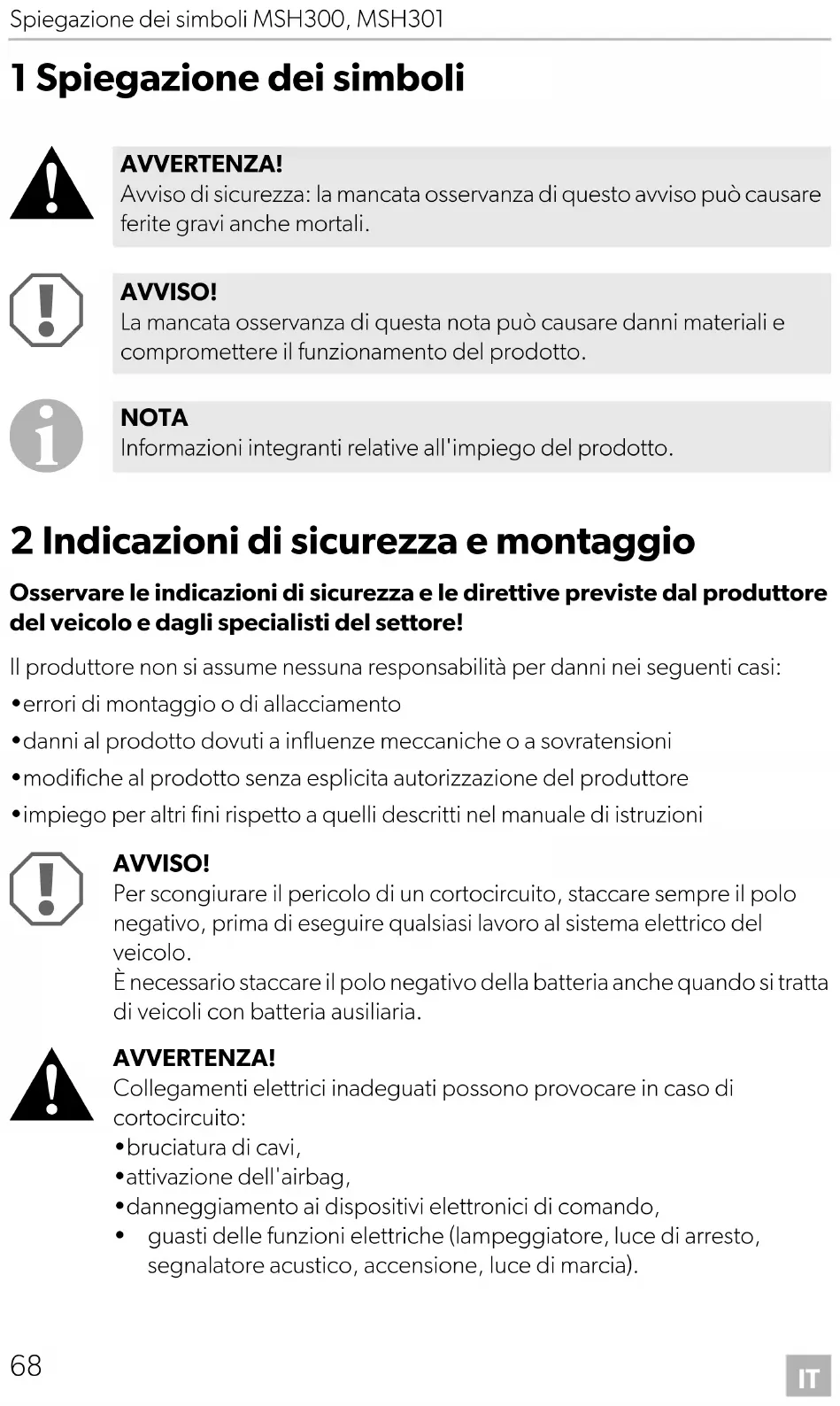- guasti delle funzioni elettriche (lampeggiatore, luce di arresto, segnalatore acustico, accensione, luce di marcia). AVVERTENZA! Avviso di sicurezza: la mancata osservanza di questo avviso può causare ferite gravi anche mortali. AVVISO! La mancata osservanza di questa nota può causare danni materiali e compromettere il funzionamento del prodotto. NOTA Informazioni integranti relative all'impiego del prodotto. MSH300--IO-16s.book Seite 68 Donnerstag, 13. Juli 2017 10:28 10IT MSH300, MSH301 Indicazioni di sicurezza e montaggio