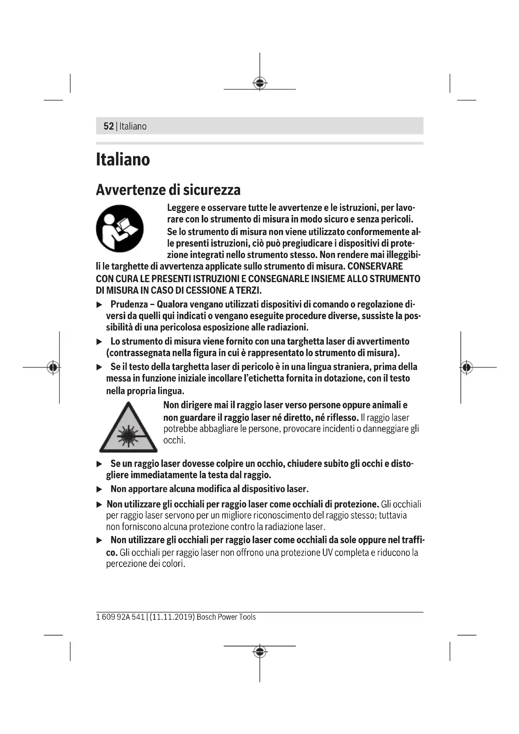 con 20–25°C C) valido nei due punti di incrocio e nei lati rispettivamente opposti D) I valori indicati presuppongono condizioni ambientali normali e/o favorevoli (ad esempio assen- za di vibrazioni, nebbia, fumo, nessuna irradiazione solare diretta). In seguito a violente oscilla- zioni di temperatura è possibile che si riscontrino perdite di precisione. E) Presenza esclusivamente di contaminazioni non conduttive, ma che, in alcune occasioni, posso- no essere rese temporaneamente conduttive dalla condensa. Per un’identificazione univoca dello strumento di misura, consultare il numero di serie (13) riportato sulla targhetta identificativa. Montaggio Introduzione/sostituzione delle pile Per l’impiego dello strumento di misura si raccomanda di utilizzare pile alcaline al manga- nese. Per aprire il coperchio del vano batterie(11) esercitare pressione sul bloccaggio(10) e quindi rimuovere il coperchio. Introdurre le batterie. Durante tale fase, prestare attenzione alla corretta polarità, riportata sul lato interno del vano batterie. Se le batterie sono esaurite, l’indicatore di stato(3) si illuminerà di rosso ed i raggi laser verranno disattivati. Spegnere lo strumento di misura e sostituire le batterie. Bosch Power Tools 1 609 92A 541 | (11.11.2019)56 | Italiano Sostituire sempre tutte le pile contemporaneamente. Utilizzare esclusivamente pile dello stesso produttore e con la stessa capacità. u Se lo strumento di misura non viene impiegato per lunghi periodi, rimuovere le pile dallo strumento stesso. Qualora le batterie rimangano per lungo tempo all’inter- no dello strumento di misura si possono verificare fenomeni di corrosione e di auto- scaricamento. Utilizzo Messa in funzione u Proteggere lo strumento di misura da liquidi e dall’esposizione diretta ai raggi solari. u Non esporre lo strumento di misura a temperature o ad oscillazioni termiche estreme. Ad esempio, evitare di lasciarlo per lungo tempo all’interno dell’auto. In ca- so di forti oscillazioni di temperatura, lasciare che lo strumento di misura raggiunga la normale temperatura prima di metterlo in funzione. Temperature oppure sbalzi di temperatura estremi possono pregiudicare la precisione dello strumento di misura. u Evitare di urtare violentemente o di far cadere lo strumento di misura. Eventuali danno allo strumento di misura possono comprometterne la precisione. Dopo un urto violento o una caduta, a scopo di controllo confrontare la linea laser con una linea di riferimento nota, orizzontale o verticale, oppure con punti a piombo verificati. u Spegnere lo strumento di misura, quando occorra trasportalo. Spegnendo lo stru- mento, viene bloccata l’unità oscillante che altrimenti potrebbe venire danneggiata in caso di movimenti violenti. Accensione/spegnimento Per accendere lo strumento di misura, spingere l’interruttore di avvio/arresto(4) in po- sizione «ON». Subito dopo l’accensione lo strumento di misura proietterà linee laser dall’apertura di uscita anteriore e superiore(6). u Non dirigere mai il raggio laser su persone oppure su animali e non rivolgere lo sguardo in direzione del raggio laser stesso, neanche da grande distanza. Per spegnere lo strumento di misura, spingere l’interruttore di accensione/spegnimento (4) in posizione OFF. In fase di spegnimento, l’unità oscillante verrà bloccata. u Non lasciare incustodito lo strumento di misura quando è acceso e spegnerlo sempre dopo l’uso. Altre persone potrebbero essere abbagliate dal raggio laser. 1 609 92A 541 | (11.11.2019) Bosch Power ToolsItaliano | 57 Modalità Lo strumento di misura dispone di modalità di funzionamento, fra le quali è sempre pos- sibile scegliere: – Modalità a linee incrociate (vedere figuraA): viene generato un piano laser orizzontale (linea laser rotante a 360°) e una linea laser verticale in avanti, – Modalità a linee incrociate e con punto a piombo (vedere figuraB): viene generato un piano laser orizzontale (linea laser rotante a 360°), due linee laser ortogonali verticali, nonché un punto a piombo verso il basso, – Modalità orizzontale (vedere figuraC): viene generato un piano laser orizzontale (linea laser rotante a 360°). Dopo l’accensione lo strumento di misura si trova nel modo operativo a linee incrociate con funzione di autolivellamento. Per variare la modalità operativa, premere il tasto per la modalità laser Mode(1). Tutte le modalità operative sono disponibili sia con funzione di autolivellamento, sia con funzione di inclinazione. Livellamento automatico Lavorare con la funzione di autolivellamento (vedereFigg.E−G) Durante il lavoro con la funzione di autolivellamento l’indicatore di stato(3) non può illu- minarsi. All’occorrenza attivare nuovamente la funzione di autolivellamento premendo il tasto funzione di inclinazione(2), in modo che l’indicatore di stato scompaia. Posizionare lo strumento di misura su un supporto stabile ed orizzontale oppure fissarlo sul treppiede(7). Il livellamento automatico compenserà automaticamente le irregolarità, entro il campo di autolivellamento di ±4°. Il livellamento sarà terminato quando le linee laser cesseranno di spostarsi. Se il livellamento automatico non è disponibile, ad esempio perché il piano di appoggio dello strumento di misura si discosta di oltre 4° dalla retta orizzontale, i raggi laser inizia- no a lampeggiare. In tale caso, sistemare lo strumento di misura orizzontalmente e attendere l’autolivella- mento. Non appena lo strumento di misura si trova all’interno del campo di autolivella- mento di ±4°, i raggi laser si illuminano in modo permanente. Al di fuori del campo di autolivellamento di ±4° non è possibile lavorare con la funzione di autolivellamento, poiché altrimenti né la precisione di livellamento dei raggi laser, né l’angolo destro tra i raggi laser possono essere garantiti. In caso di vibrazioni o variazioni di lunghezza durante il funzionamento, il livellamento dello strumento di mi