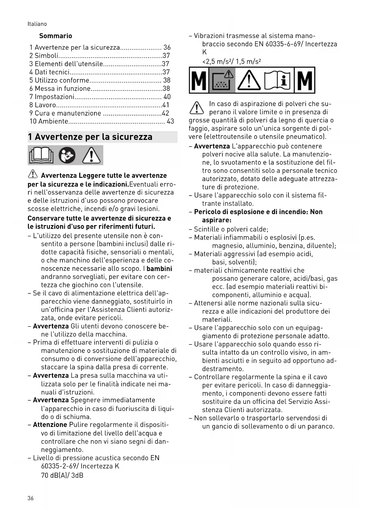 <2,5 m/s²/ 1,5 m/s² In caso di aspirazione di polveri che su perano il valore limite o in presenza di grosse quantità di polveri da legno di quercia o faggio, aspirare solo un'unica sorgente di pol vere (elettroutensile o utensile pneumatico). – Avvertenza L'apparecchio può contenere polveri nocive alla salute. La manutenzio ne, lo svuotamento e la sostituzione del fil tro sono consentiti solo a personale tecnico autorizzato, dotato delle adeguate attrezza ture di protezione. – Usare l'apparecchio solo con il sistema fil trante installato. – Pericolo di esplosione e di incendio: Non aspirare: – Scintille o polveri calde; – Materiali infiammabili o esplosivi (p.es. magnesio, alluminio, benzina, diluente); – Materiali aggressivi (ad esempio acidi, basi, solventi); – materiali chimicamente reattivi che possano generare calore, acidi/basi, gas ecc. (ad esempio materiali reattivi bi componenti, alluminio e acqua). – Attenersi alle norme nazionali sulla sicu rezza e alle indicazioni del produttore dei materiali. – Usare l'apparecchio solo con un equipag giamento di protezione personale adatto. – Usare l'apparecchio solo quando esso ri sulta intatto da un controllo visivo, in am bienti asciutti e in seguito ad opportuno ad destramento. – Controllare regolarmente la spina e il cavo per evitare pericoli. In caso di danneggia mento, i componenti devono essere fatti sostituire da un officina del Servizio Assi stenza Clienti autorizzata. – Non sollevarlo o trasportarlo servendosi di un gancio di sollevamento o di un paranco. Italiano 362 Simboli Avvertenza di pericolo generico Avvertenza sulle scariche elettriche Leggere le istruzioni e le avvertenze. Indossare un dispositivo di protezione delle vie respiratorie. Avvertenza L'apparecchio può contenere polveri nocive alla salute. Adatto per la separazione di pol veri con un valore limite di esplo sione di 0,1 mg/m