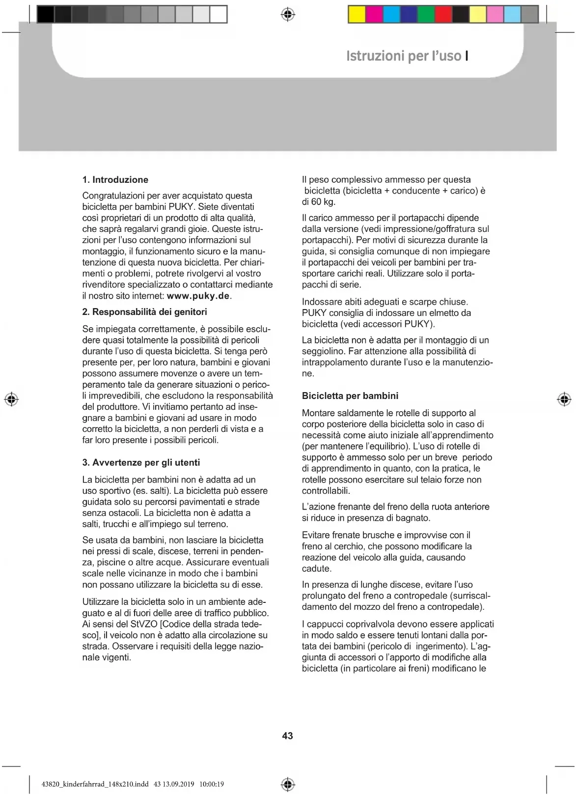 Congratulazioni per aver acquistato questa bicicletta per bambini PUKY. Siete diventati così proprietari di un prodotto di alta qualità, che saprà regalarvi grandi gioie. Queste istru- zioni per l’uso contengono informazioni sul montaggio, il funzionamento sicuro e la manu- tenzione di questa nuova bicicletta. Per chiari- menti o problemi, potrete rivolgervi al vostro rivenditore specializzato o contattarci mediante il nostro sito internet: www.puky.de.