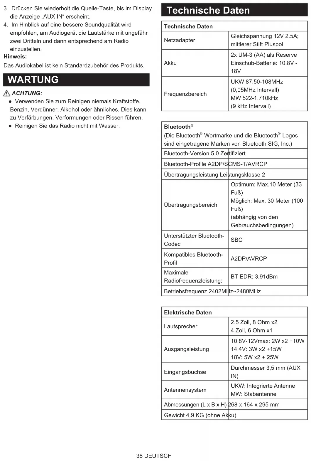 dispositivo esterno sopra i 2/3 del livello massimo, per poi regolarlo direttamente dalla radio. Nota: Il cavo audio non è incluso come accessorio standard. MANUTENZIONE ATTENZIONE: ● Evitare assolutamente l’uso di benzine, diluenti, solventi, alcol o sostanze simili. In caso contrario, potrebbero vericarsi scoloriture, deformazioni e incrinature. ● Non lavare la radio con acqua. Technische Daten Technische Daten Netzadapter Gleichspannung 12V 2.5A; mittlerer Stift Pluspol Akku 2x UM-3 (AA) als Reserve Einschub-Batterie: 10,8V - 18V Frequenzbereich UKW 87,50-108MHz (0,05MHz Intervall) MW 522-1.710kHz (9 kHz Intervall) Bluetooth