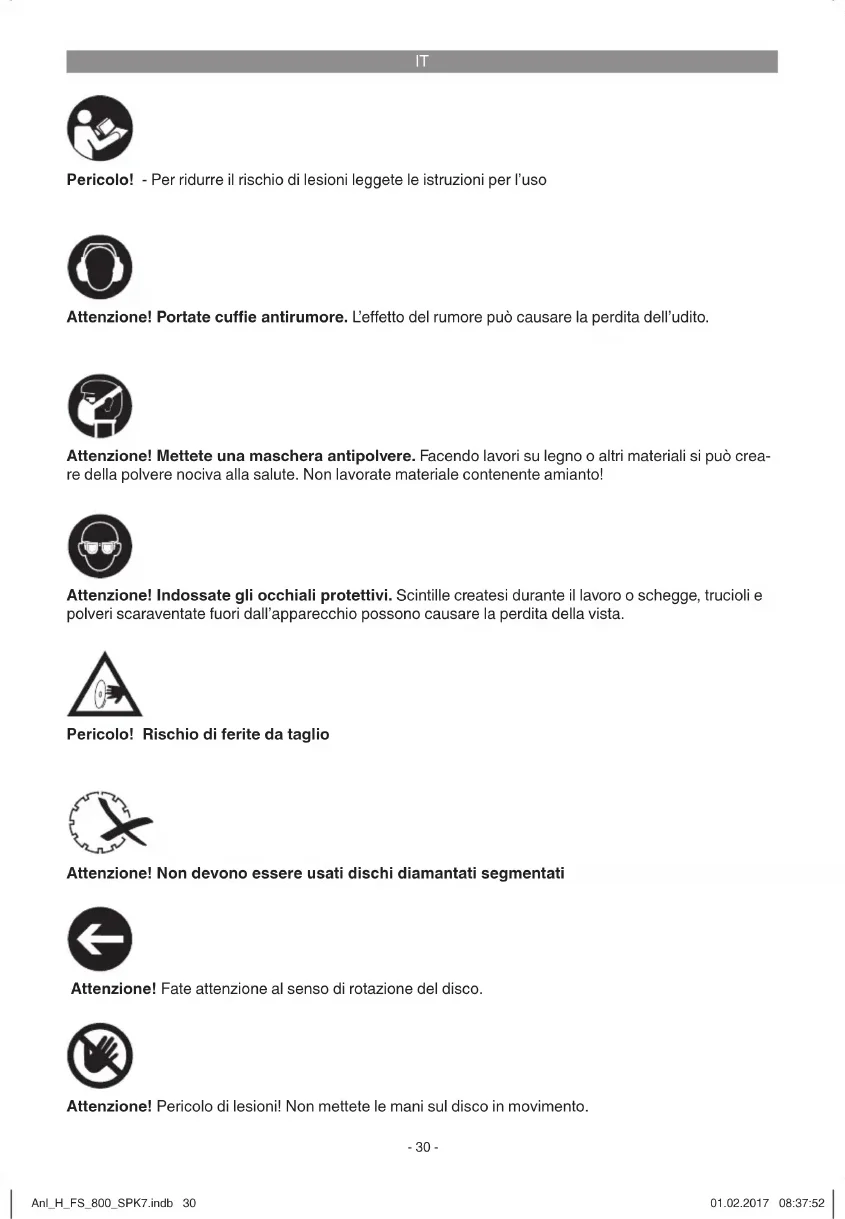 Pericolo! Rischio di ferite da taglio Attenzione! Non devono essere usati dischi diamantati segmentati Pericolo! - Per ridurre il rischio di lesioni leggete le istruzioni per l’uso Attenzione! Portate cuffi e antirumore. L’e ff etto del rumore può causare la perdita dell’udito. Attenzione! Indossate gli occhiali protettivi. Scintille createsi durante il lavoro o schegge, trucioli e polveri scaraventate fuori dall’apparecchio possono causare la perdita della vista. Attenzione! Mettete una maschera antipolvere. Facendo lavori su legno o altri materiali si può crea- re della polvere nociva alla salute. Non lavorate materiale contenente amianto! Attenzione! Pericolo di lesioni! Non mettete le mani sul disco in movimento. Attenzione! Fate attenzione al senso di rotazione del disco. Anl_H_FS_800_SPK7.indb 30Anl_H_FS_800_SPK7.indb 30 01.02.2017 08:37:5201.02.2017 08:37:52IT