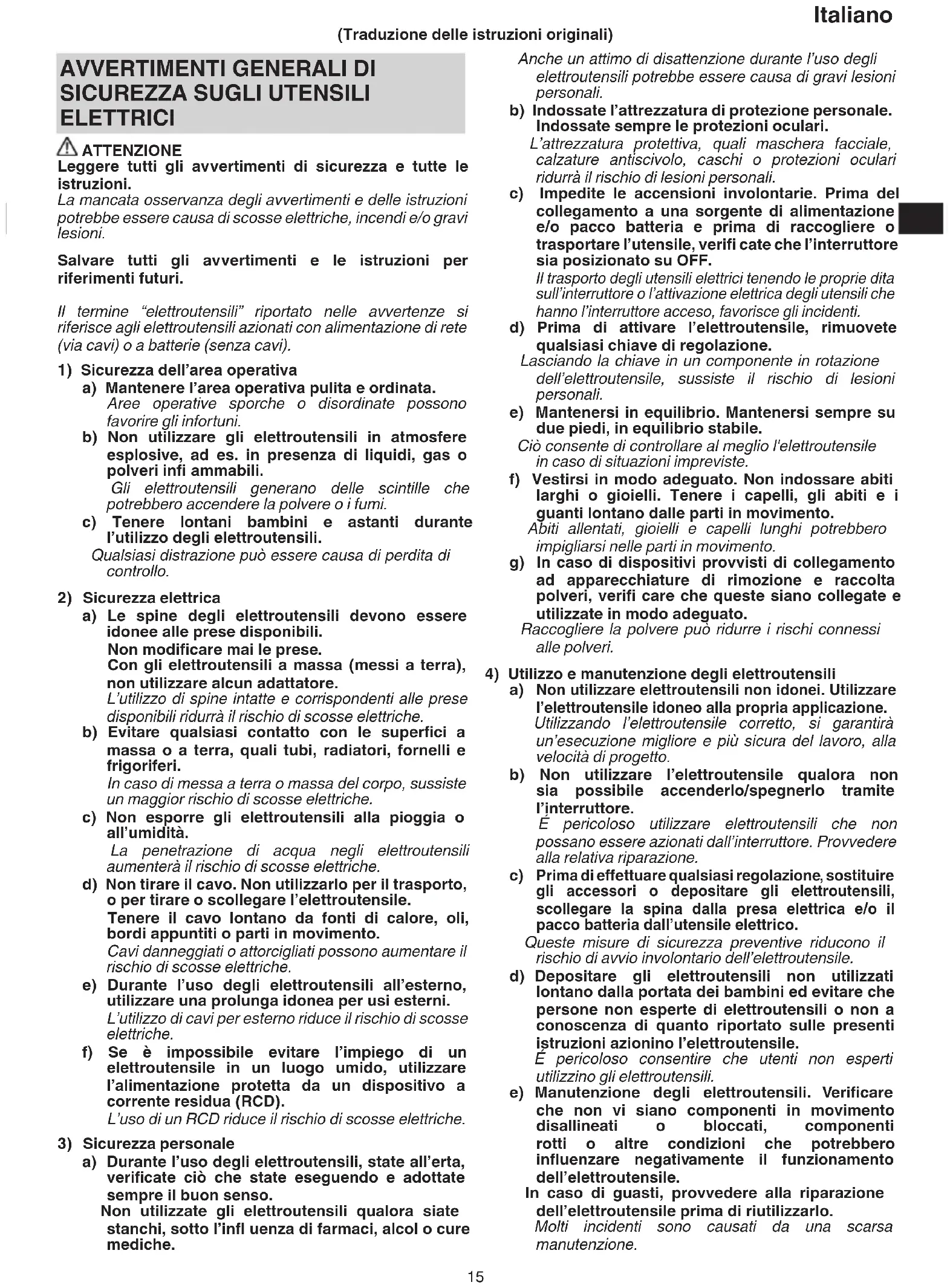 ELETTRICI ATTENZIONE Leggere tutti gli avvertimenti di sicurezza e tutte le istruzioni. La mancata osservanza degli avvertimenti e delle istruzioni potrebbe essere causa di scosse elettriche, incendi e/o gravi lesioni. Salvare tutti gli avvertimenti e le istruzioni per riferimenti futuri. Il termine “elettroutensili” riportato nelle avvertenze si riferisce agli elettroutensili azionati con alimentazione di rete (via cavi) o a batterie (senza cavi).