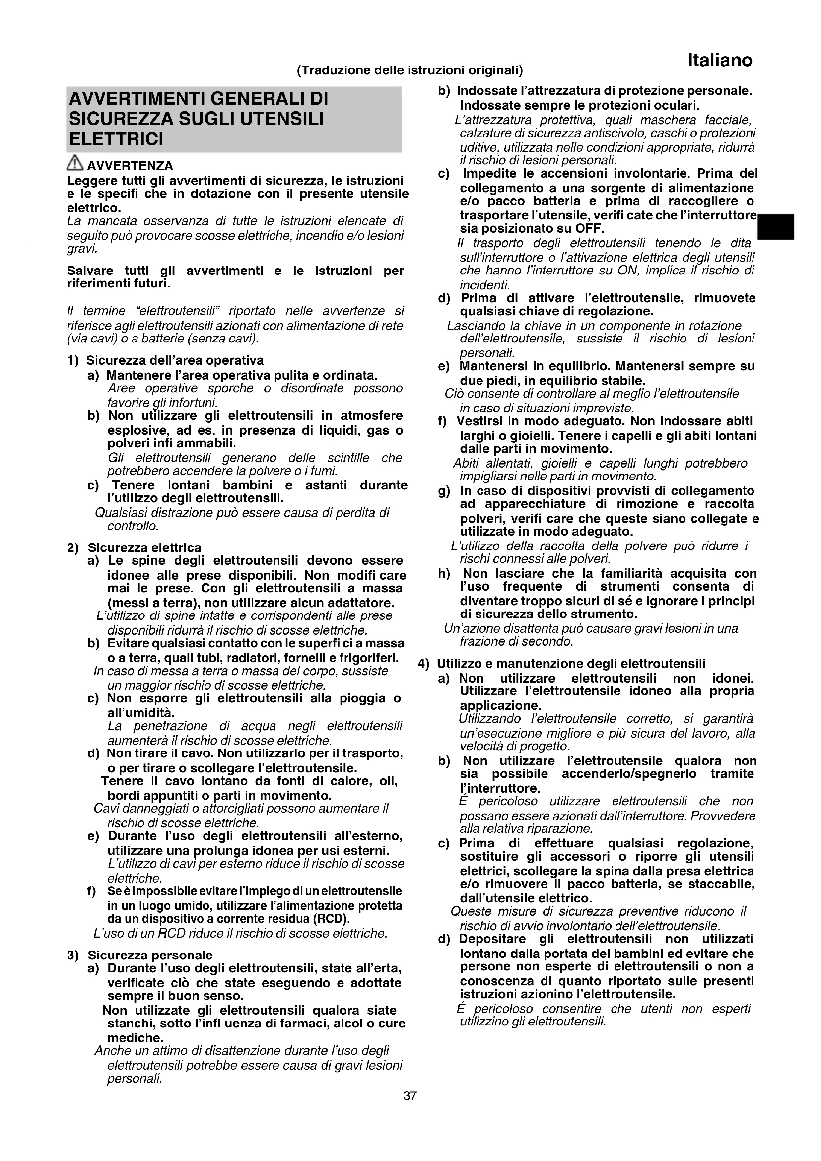 ELETTRICI AVVERTENZA Leggere tutti gli avvertimenti di sicurezza, le istruzioni e le specifi che in dotazione con il presente utensile elettrico. La mancata osservanza di tutte le istruzioni elencate di seguito può provocare scosse elettriche, incendio e/o lesioni gravi. Salvare tutti gli avvertimenti e le istruzioni per riferimenti futuri. Il termine “elettroutensili” riportato nelle avvertenze si riferisce agli elettroutensili azionati con alimentazione di rete (via cavi) o a batterie (senza cavi).