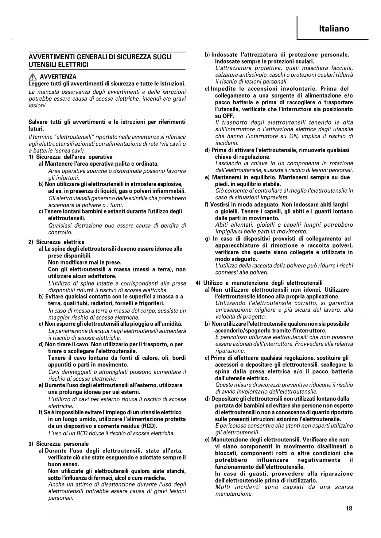 UTENSILI ELETTRICI AVVERTENZA Leggere tutti gli avvertimenti di sicurezza e tutte le istruzioni. La mancata osservanza degli avvertimenti e delle istruzioni potrebbe essere causa di scosse elettriche, incendi e/o gravi lesioni. Salvare tutti gli avvertimenti e le istruzioni per riferimenti futuri. Il termine “elettroutensili” riportato nelle avvertenze si riferisce agli elettroutensili azionati con alimentazione di rete (via cavi) o a batterie (senza cavi).