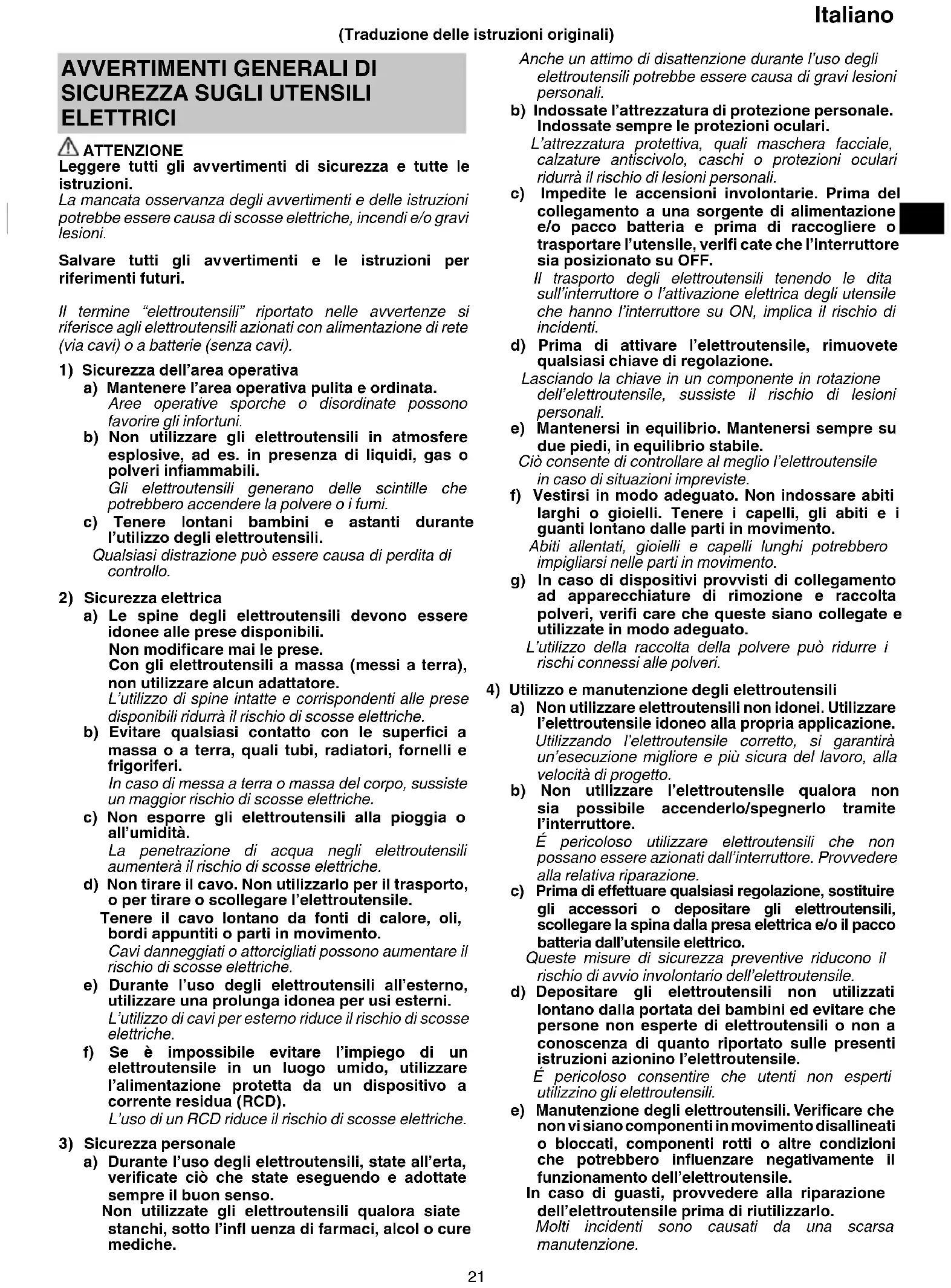 ELETTRICI ATTENZIONE Leggere tutti gli avvertimenti di sicurezza e tutte le istruzioni. La mancata osservanza degli avvertimenti e delle istruzioni potrebbe essere causa di scosse elettriche, incendi e/o gravi lesioni. Salvare tutti gli avvertimenti e le istruzioni per riferimenti futuri. Il termine “elettroutensili” riportato nelle avvertenze si riferisce agli elettroutensili azionati con alimentazione di rete (via cavi) o a batterie (senza cavi).