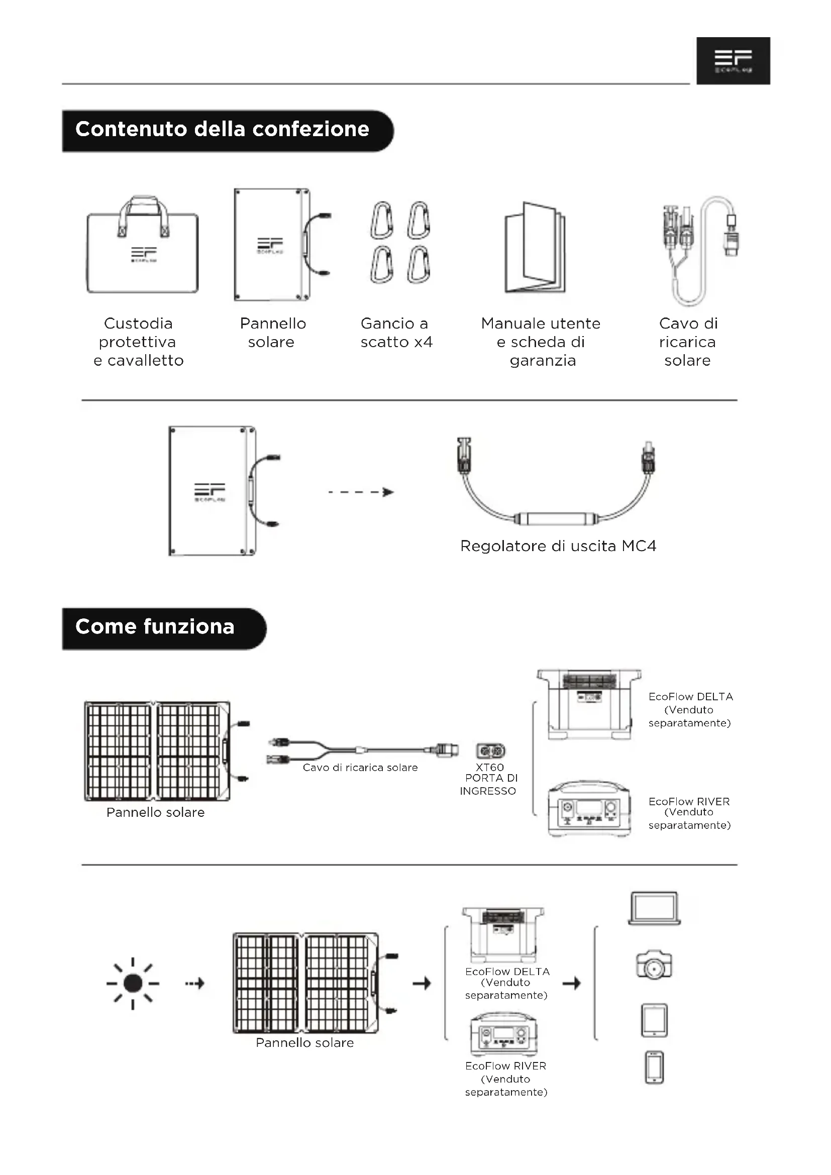 Contattaci: ecoflow.com NA/LA/APAC/MEA: support@ecoflow.com EU: support.eu@ecoflow.com AU: support.au@ecoflow.comContenuto della confezione Come funziona Custodia protettiva ecavalletto Regolatore di uscita MC4 EcoFlow RIVER (Venduto separatamente) EcoFlow RIVER (Venduto separatamente) EcoFlow DELTA (Venduto separatamente) EcoFlow DELTA (Venduto separatamente) Cavo di ricarica solare XT60 PORTA DI INGRESSO Pannello solare Gancio a scatto x4 Cavo di ricarica solare Pannello solare Pannello solare Manuale utente e scheda di garanziaConfigurazione del pannello solare